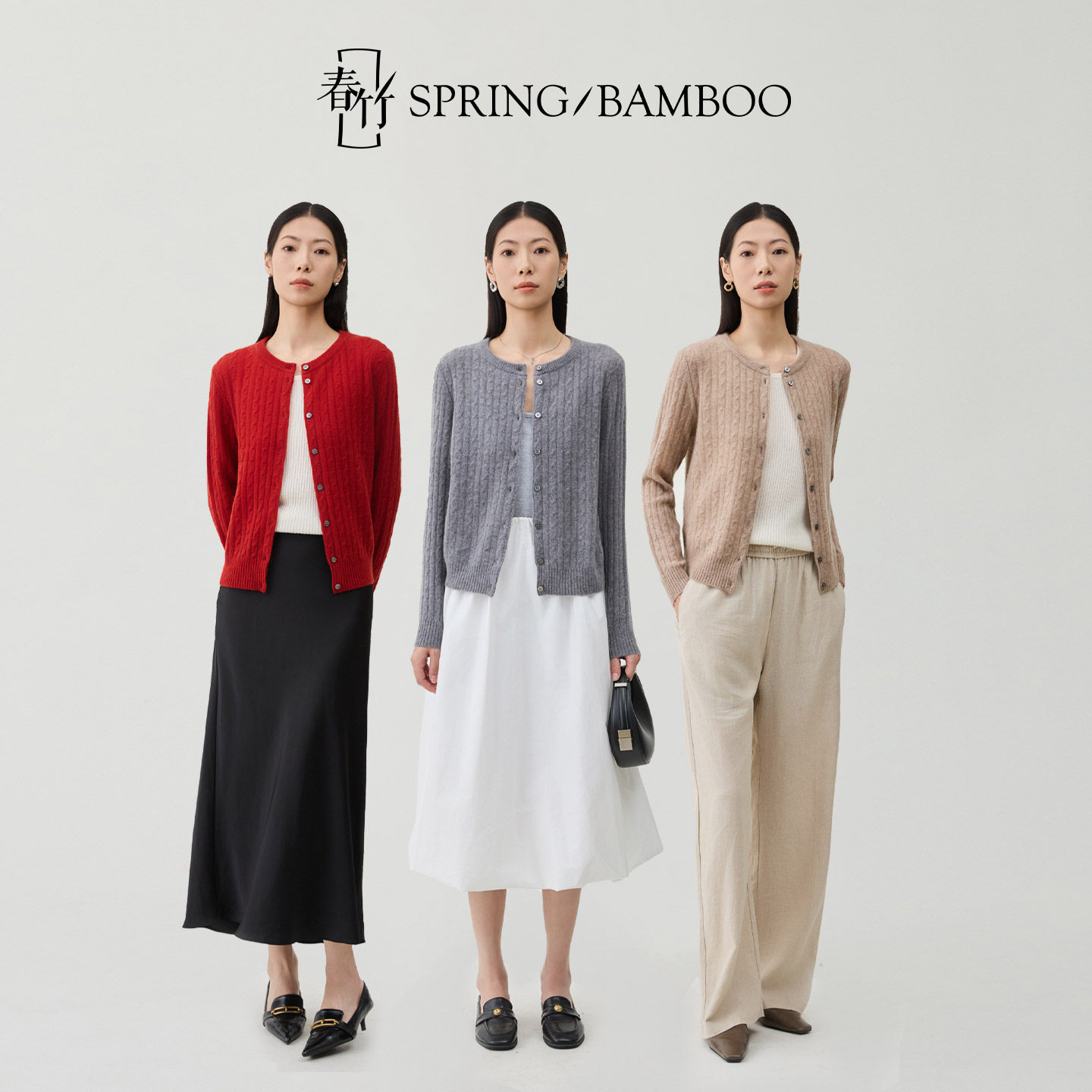 📚 春竹秋冬新款100%山羊绒圆领合体全身绞花长袖女士针织开衫