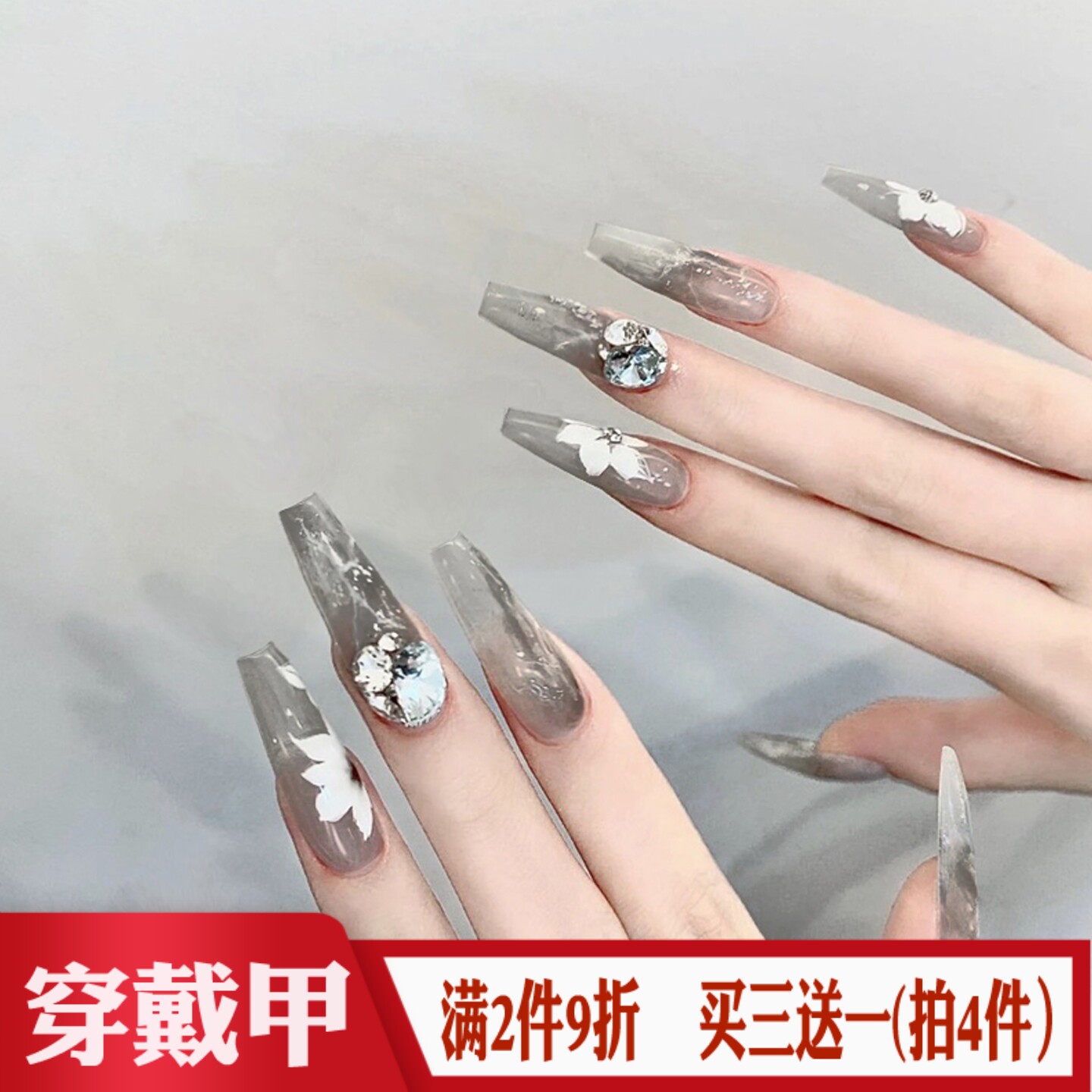 📚 冷灰色烟染花瓣堆钻穿戴甲成品清冷感美甲长梯型假指甲片2025新款