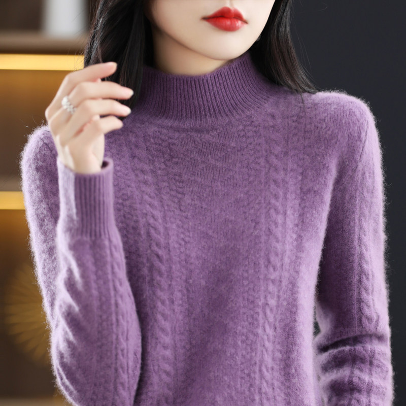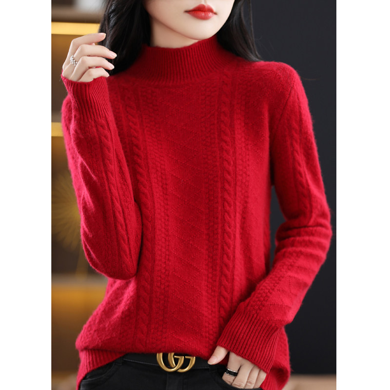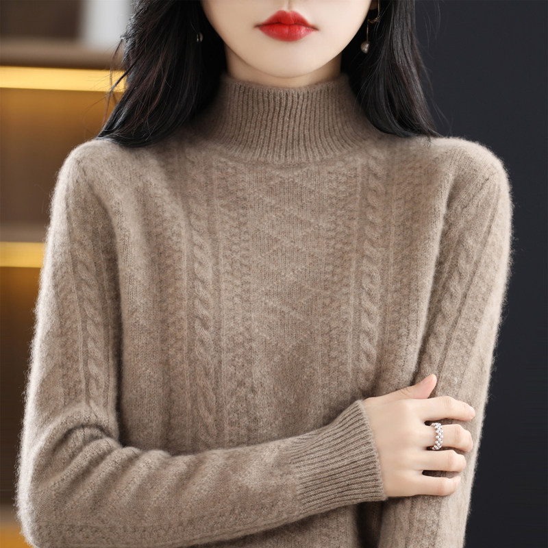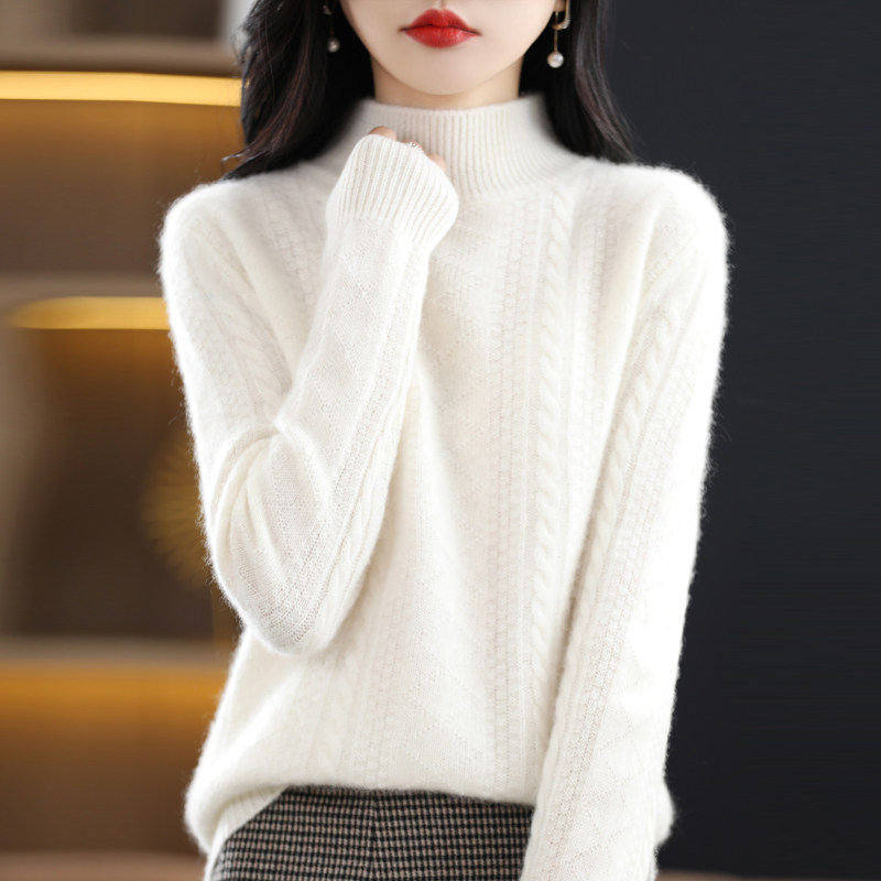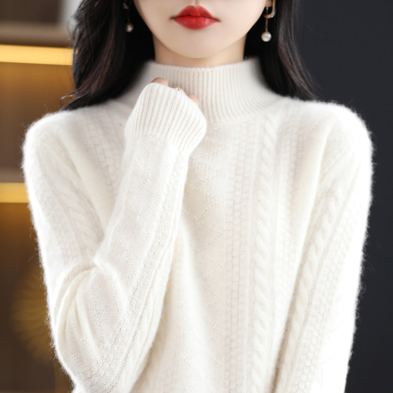 📚 慵懒风半高领绞花毛衣女白色宽松套头保暖针织衫