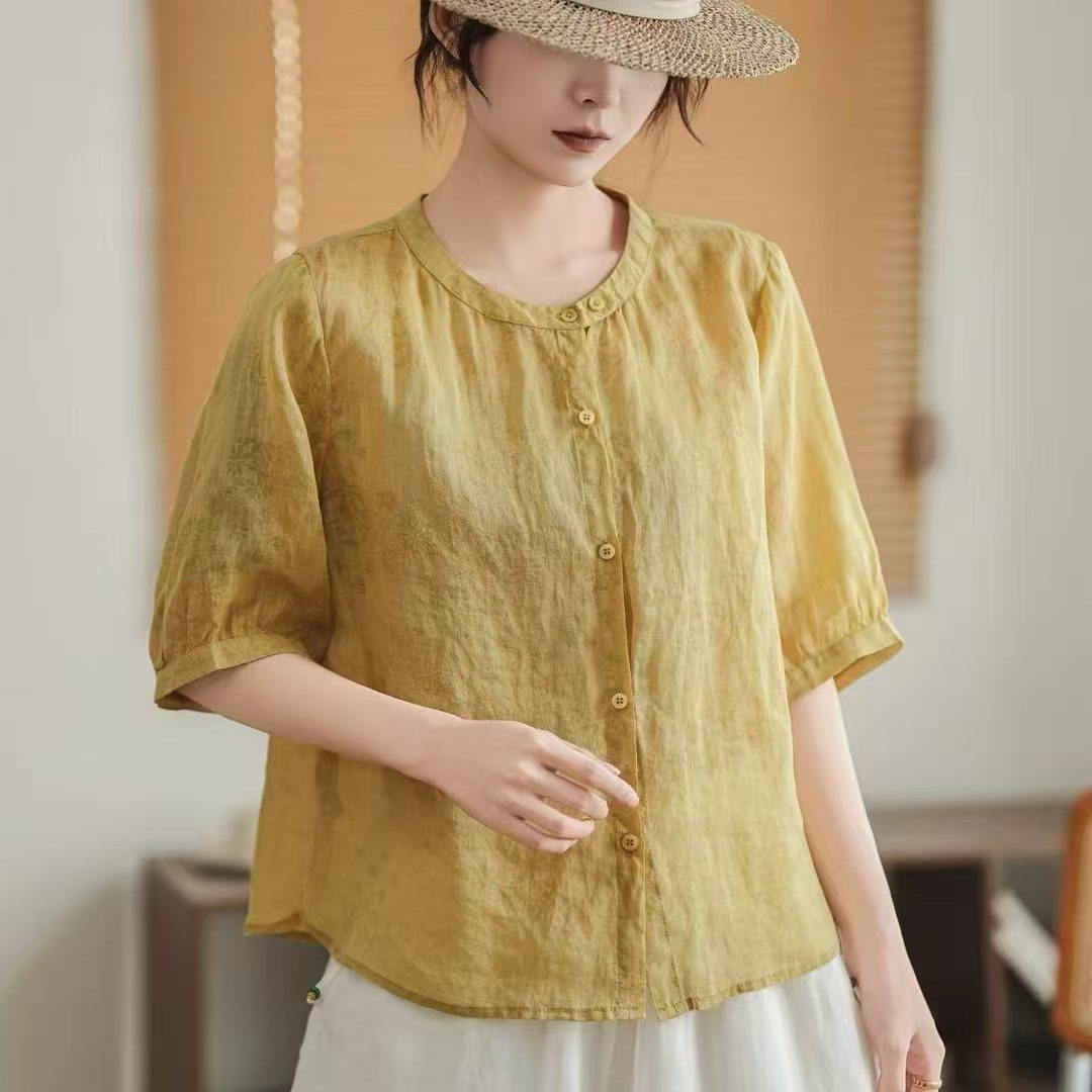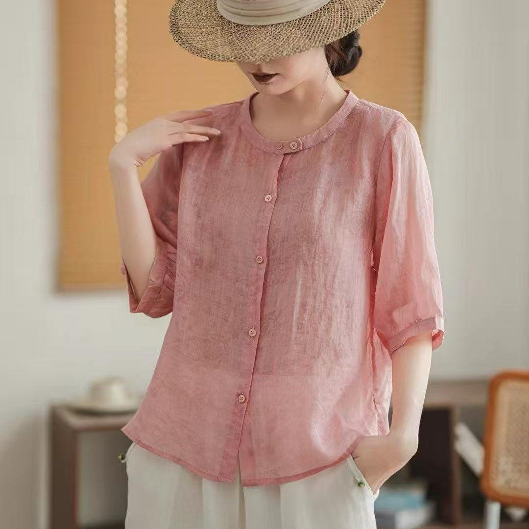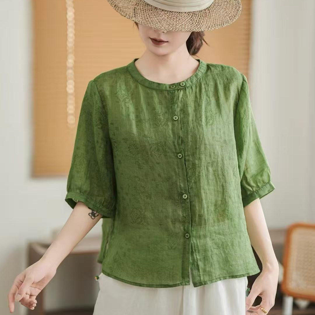 📚 文艺休闲暗花100%苎麻衬衫女夏季新款薄款宽松透气衬衣单排扣上衣