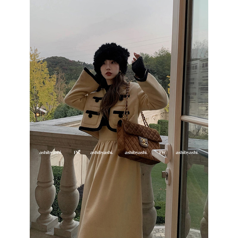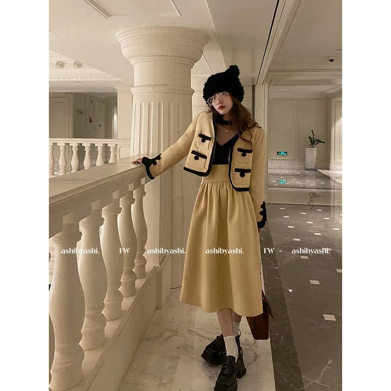 📚 大于诗集 法式小香风毛呢短款外套女高腰A字中长款半身裙套装秋冬