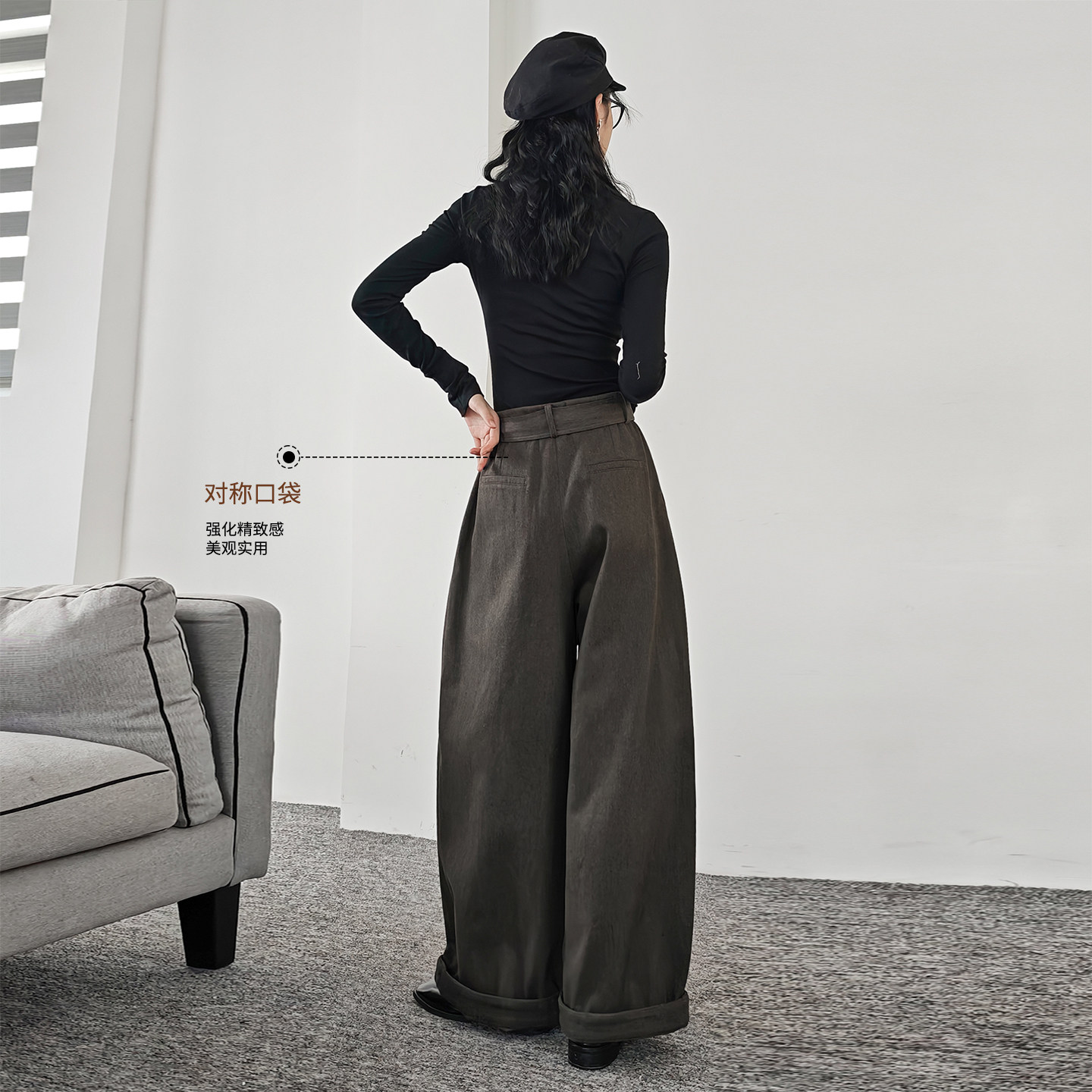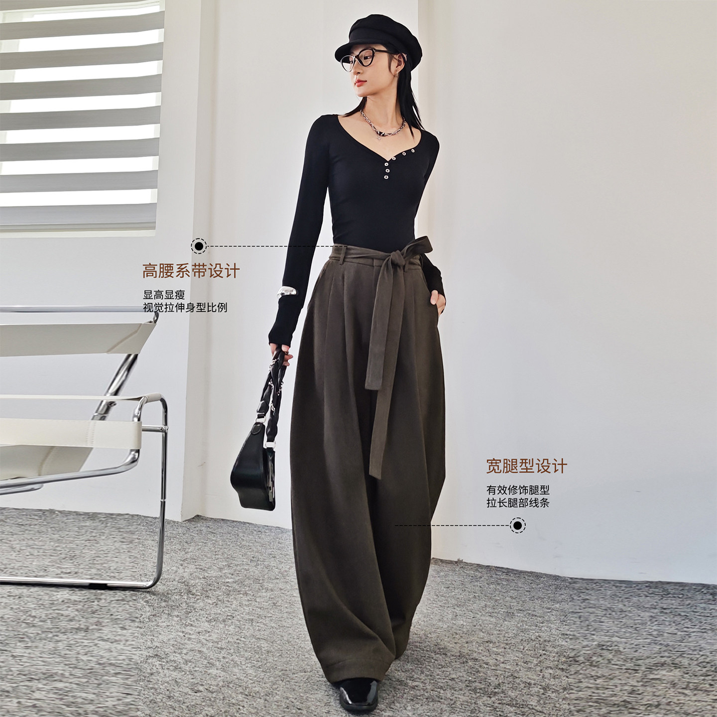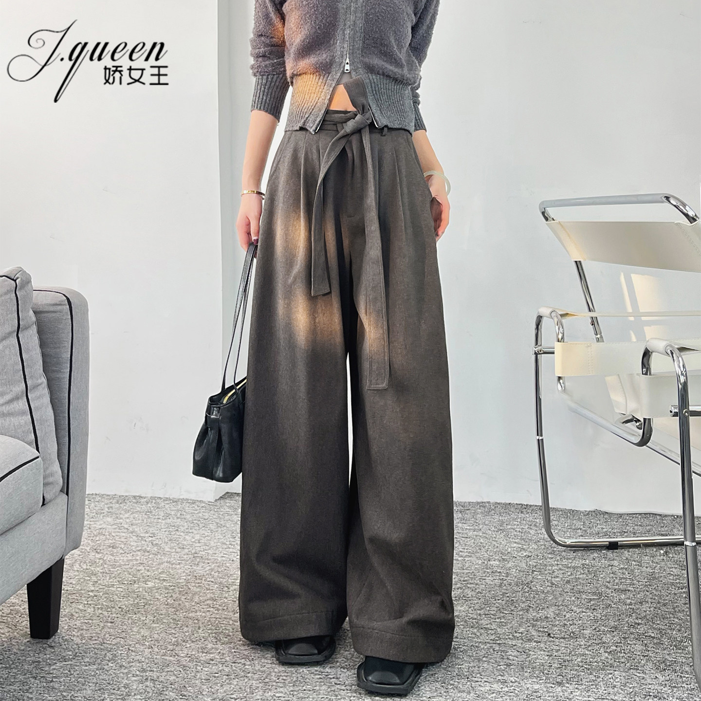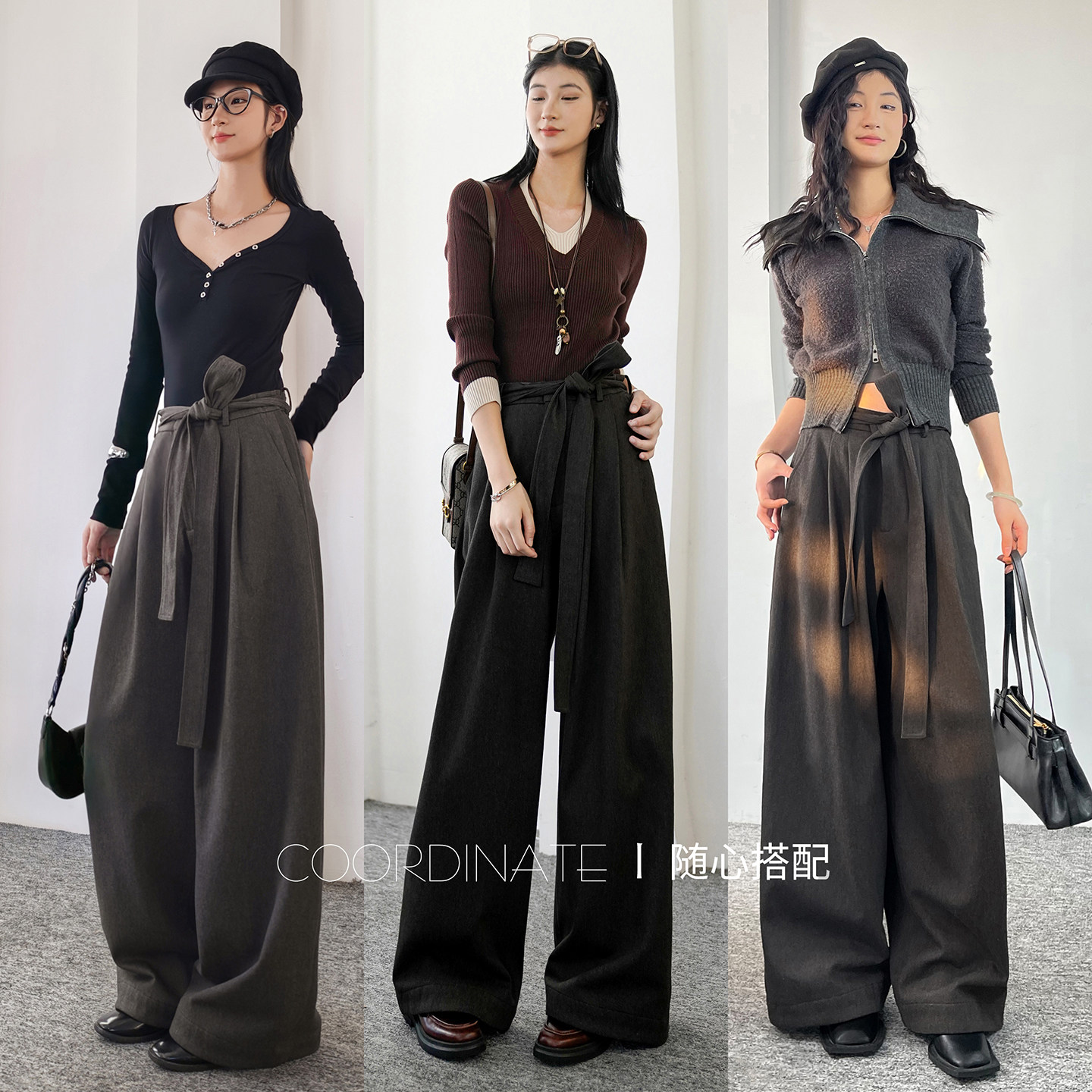 📚 弯刀系带阔腿裤女春秋中高腰显瘦高级感绑带拖地休闲工装灰色长裤
