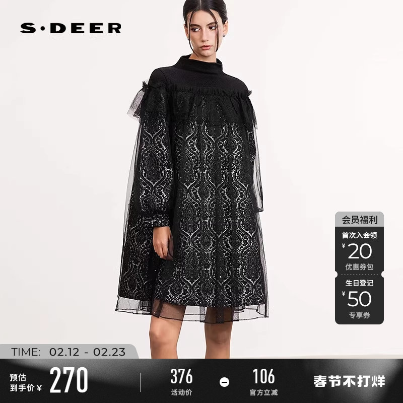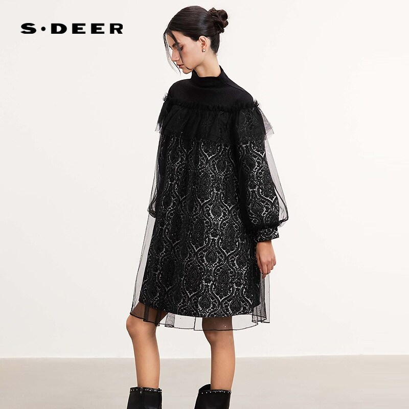 📚 sdeer圣迪奥冬装女装半高领网纱抽褶印花连衣裙S244Z12A4