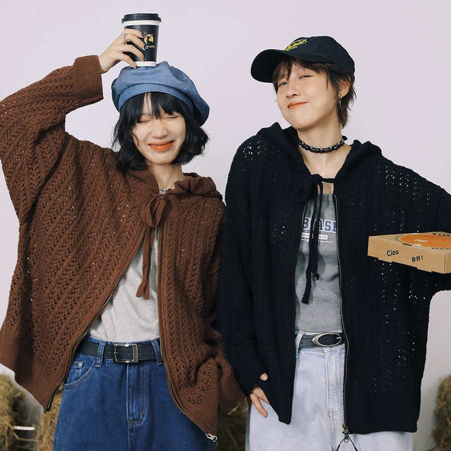 📚 STILLYOU慵懒多巴胺彩色细麻花连帽双拉链毛衣开衫女宽松针织外套