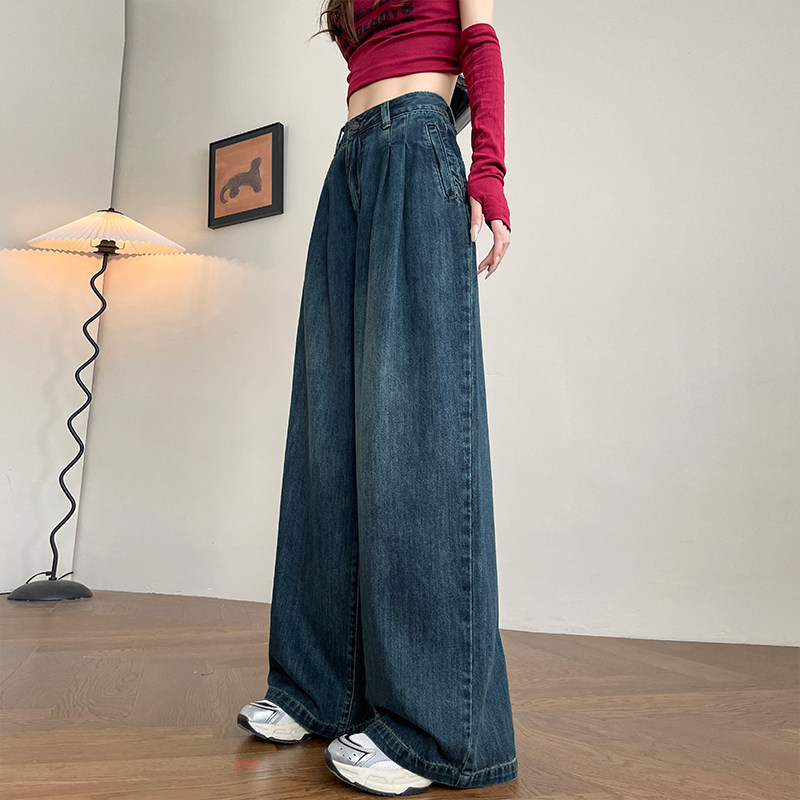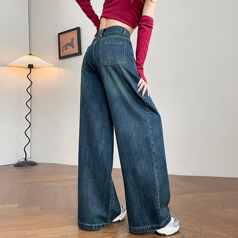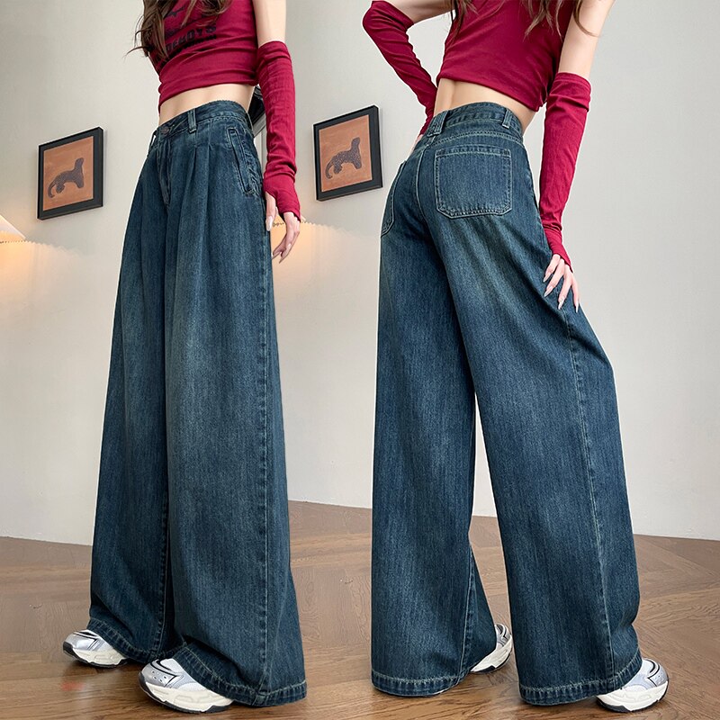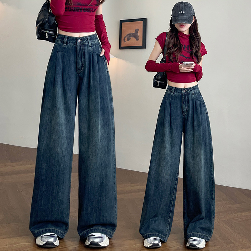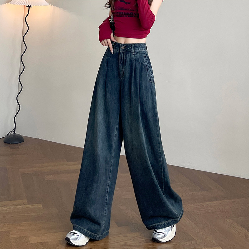 📚 美式复古蓝牛仔裤女百搭新款高腰宽松显瘦阔腿裤垂感直筒拖地长裤