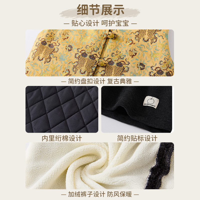 🧥面料柔软舒适,触感极佳。穿在宝宝身上,既保暖又不会觉得过于厚重。这款套装的设计既符合新中式风格,又不失现代感,可以说是冬日里的温暖守护者。