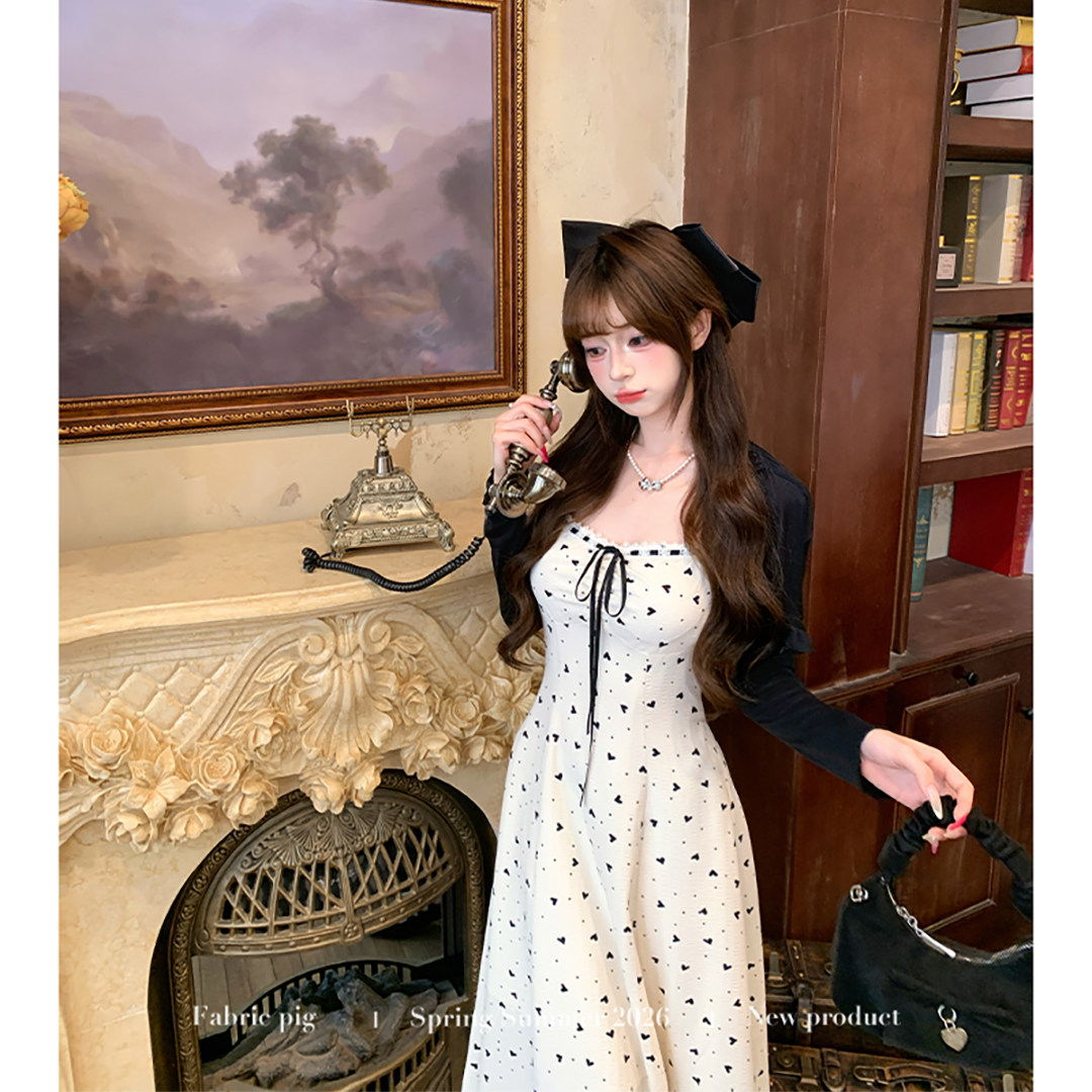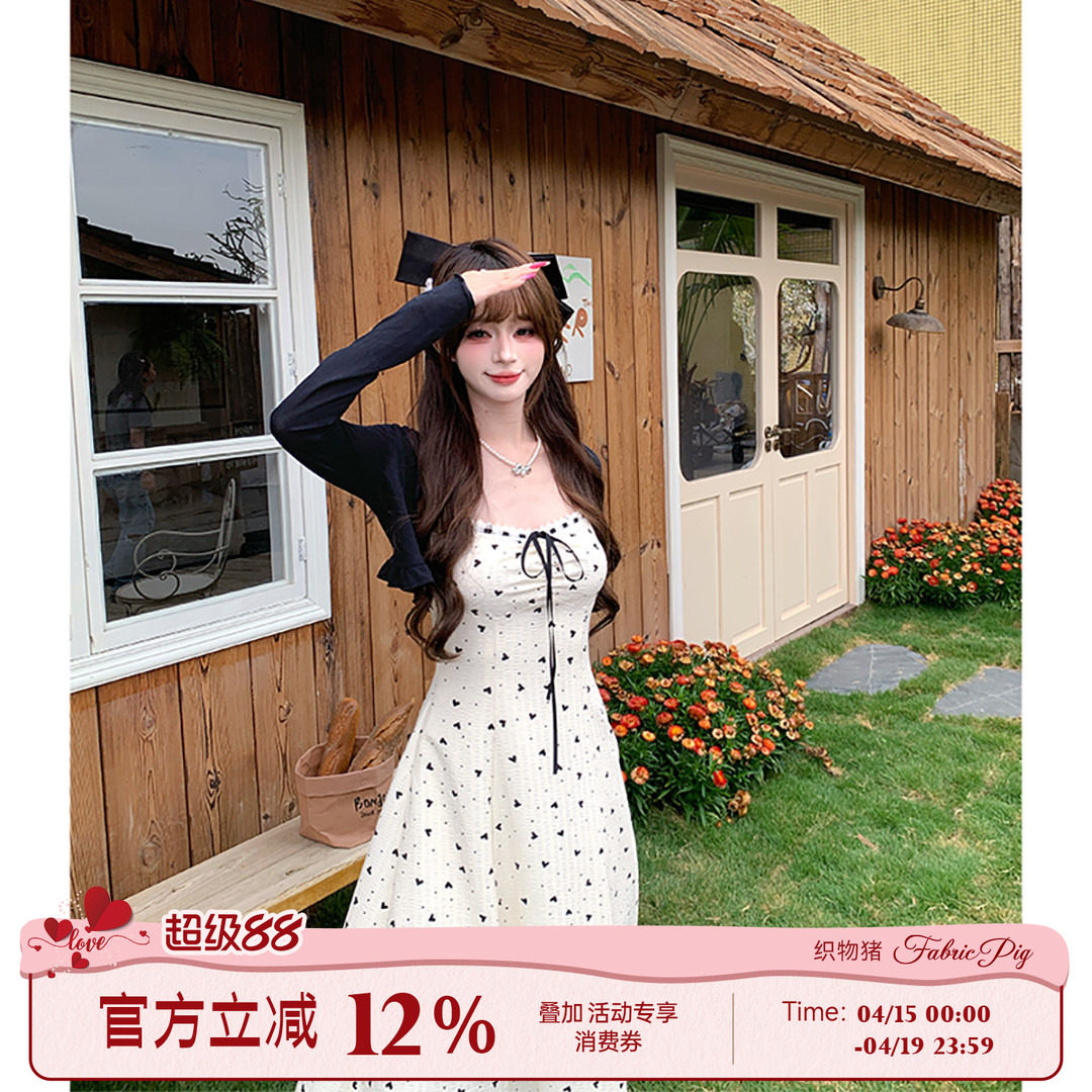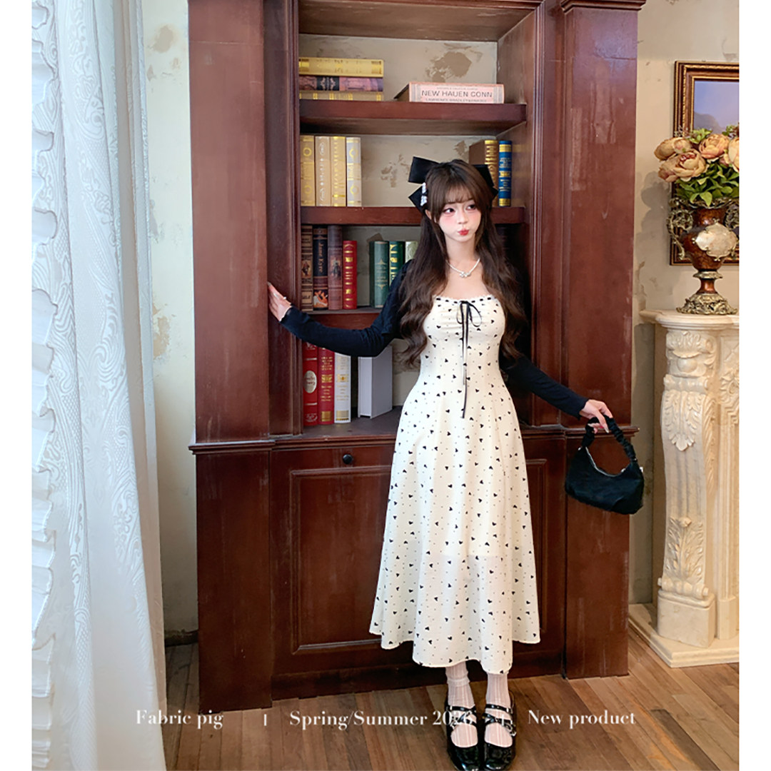 📚 织物猪 香草奶盖 黑白爱心碎花吊带连衣裙女夏季甜美风收腰长裙子