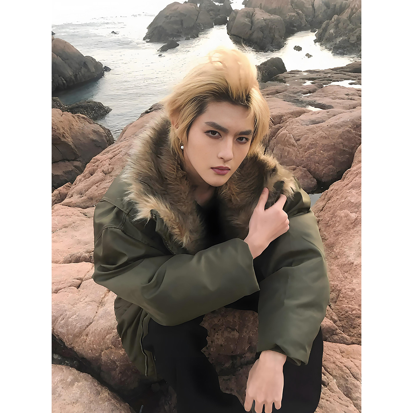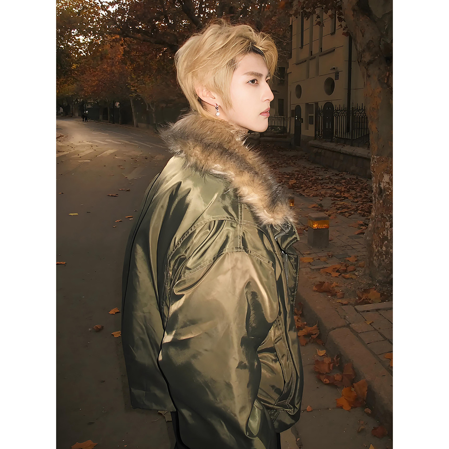 📚 美式复古座山雕毛领棉服男款冬季痞帅加厚棉衣仿狼毛一件过冬外套