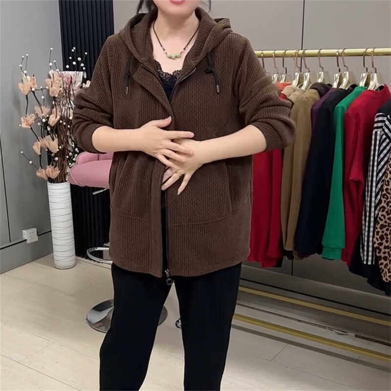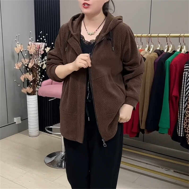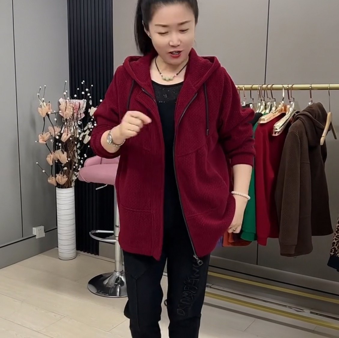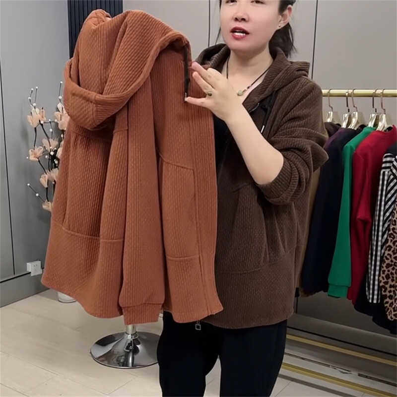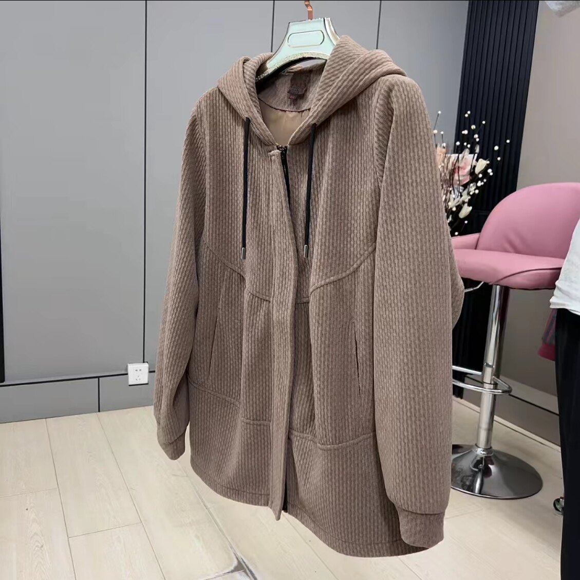 📚 2024秋季高档简约胖妹妹雪尼尔纯色长袖连帽拉链开衫外套宽松百搭