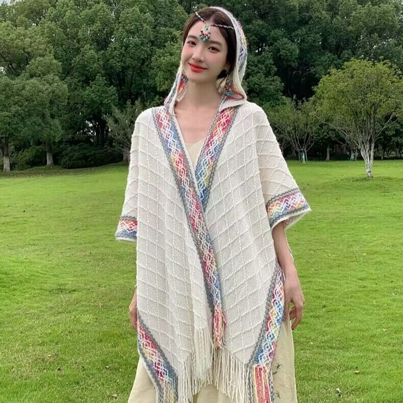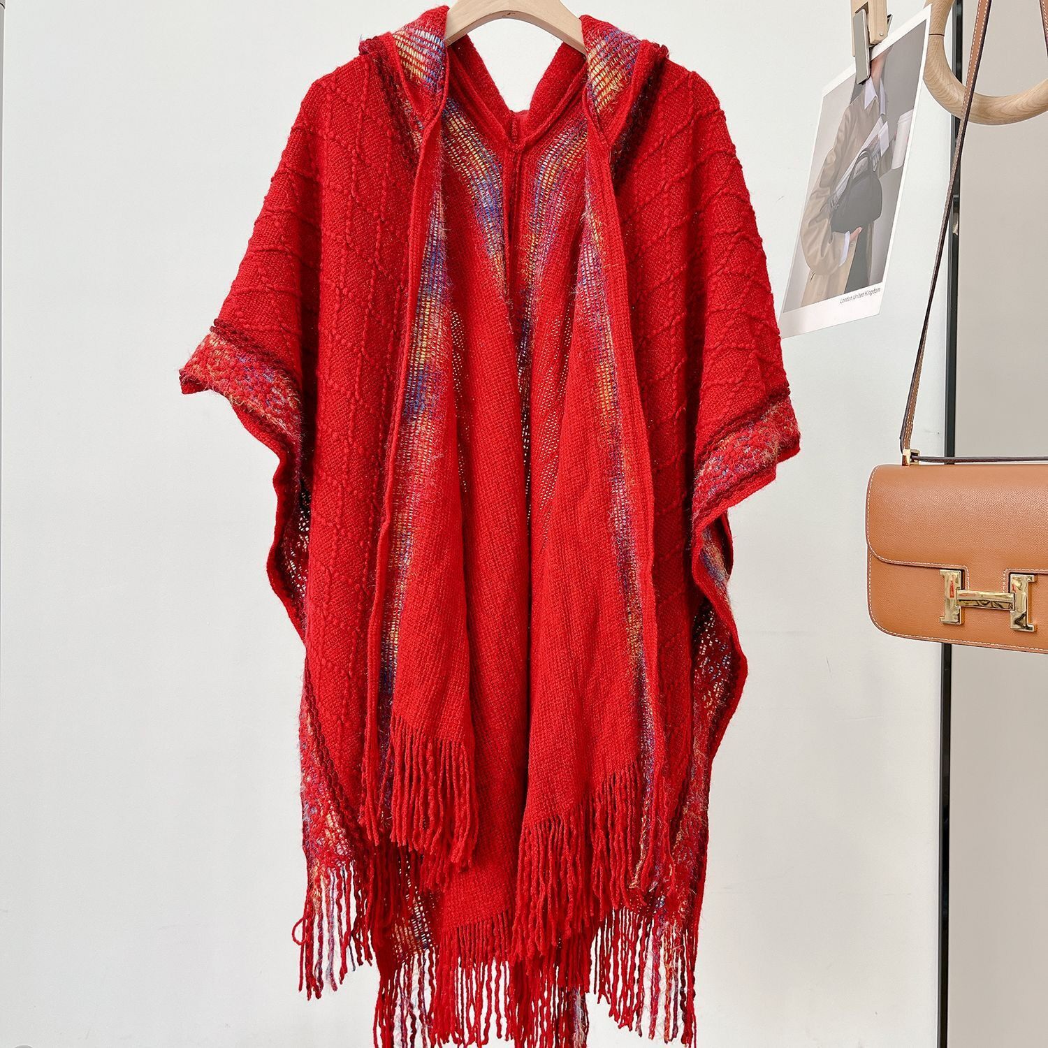 📚 新款仿羊绒长款带帽针织披肩百搭尽显洋气时尚民族风格女士披肩