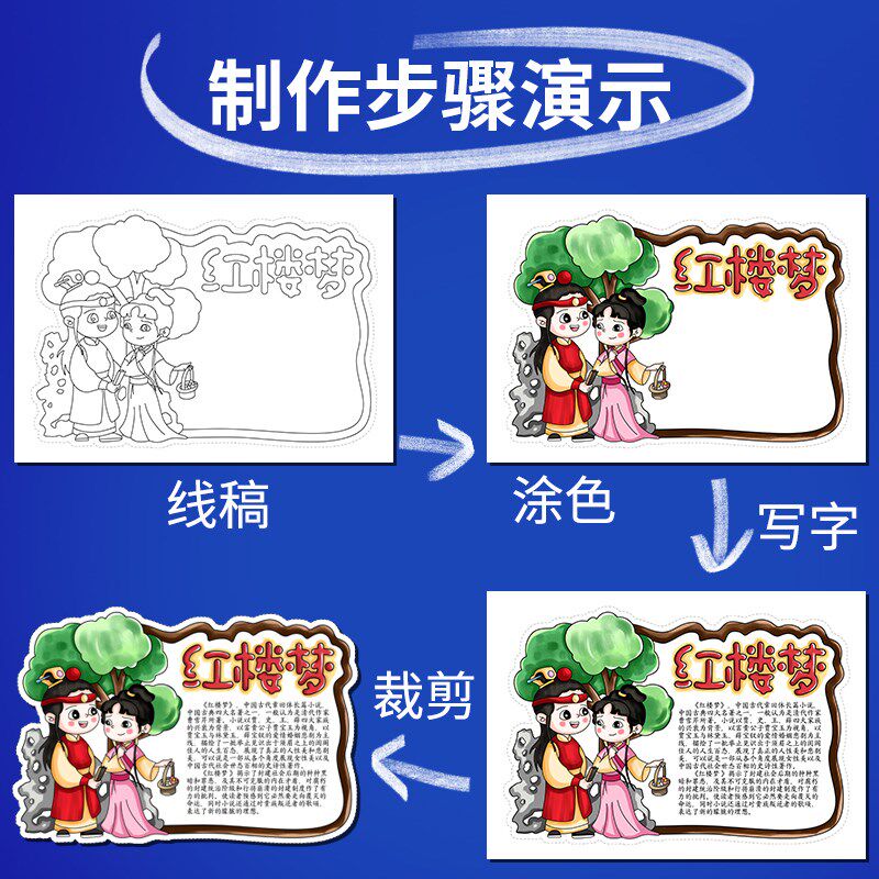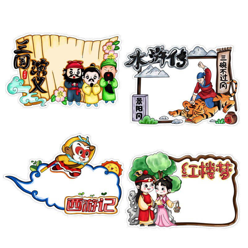 📚 读书卡小学生四大名著阅读手抄报黑白线稿涂色卡手工制作DIY模板