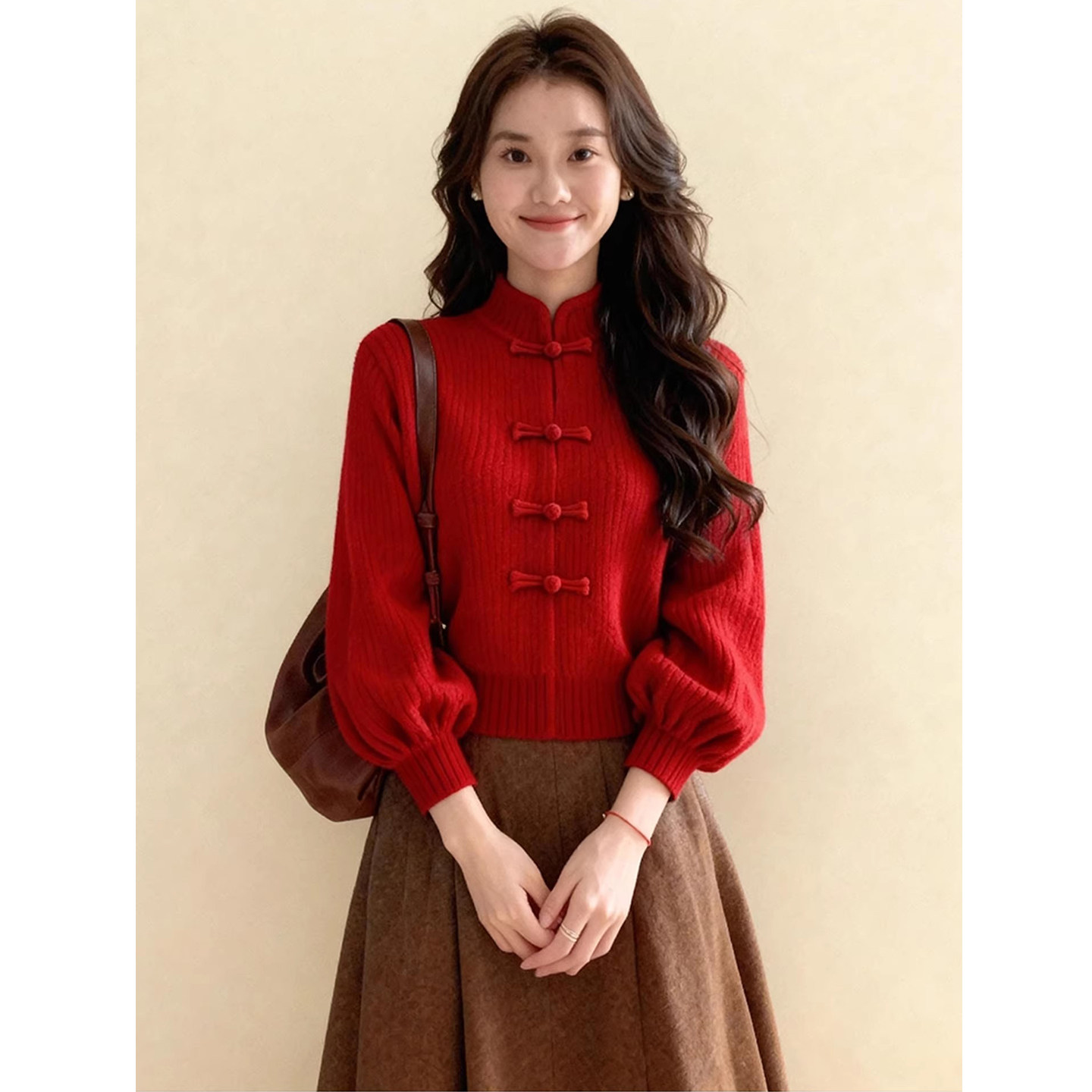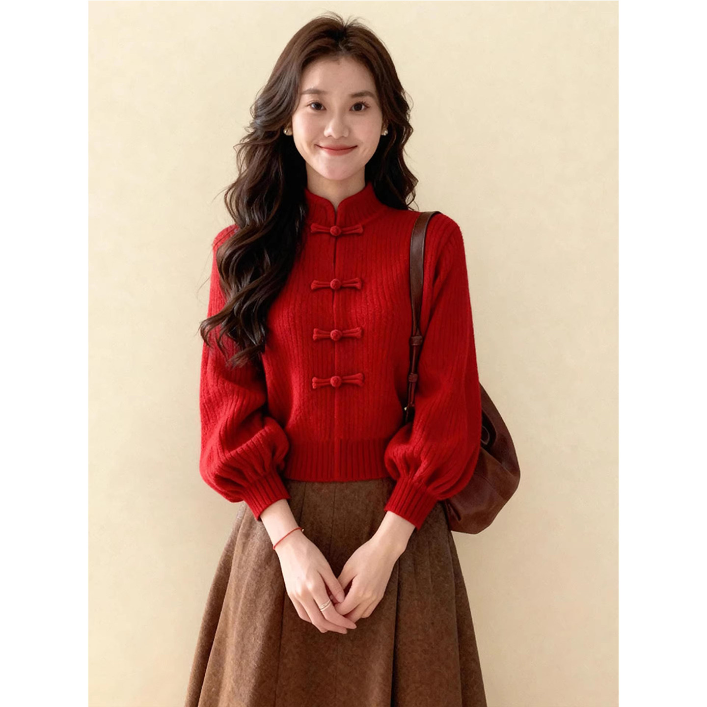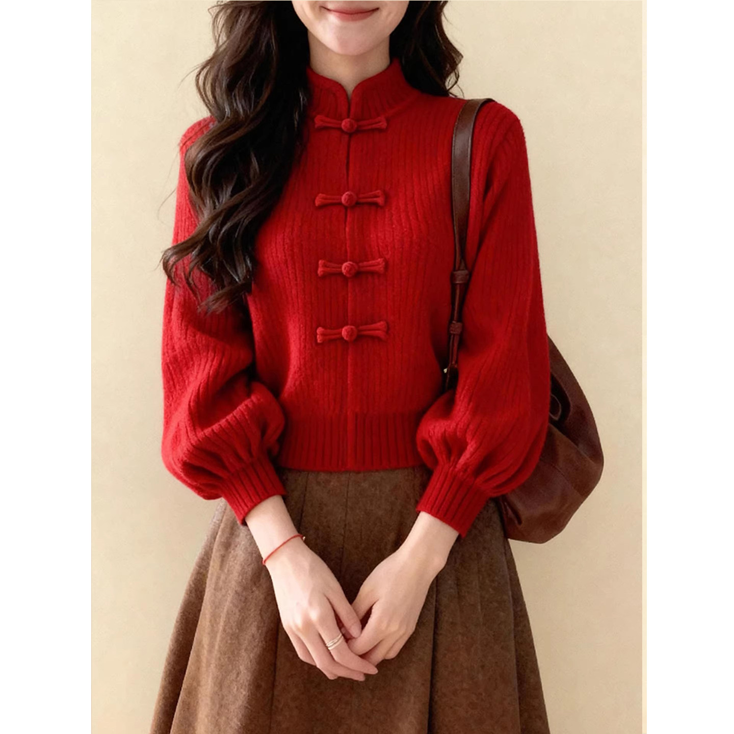 📚 新中式红色立领盘扣粗线毛衣2025秋季独特超好看短款灯笼袖针织衫