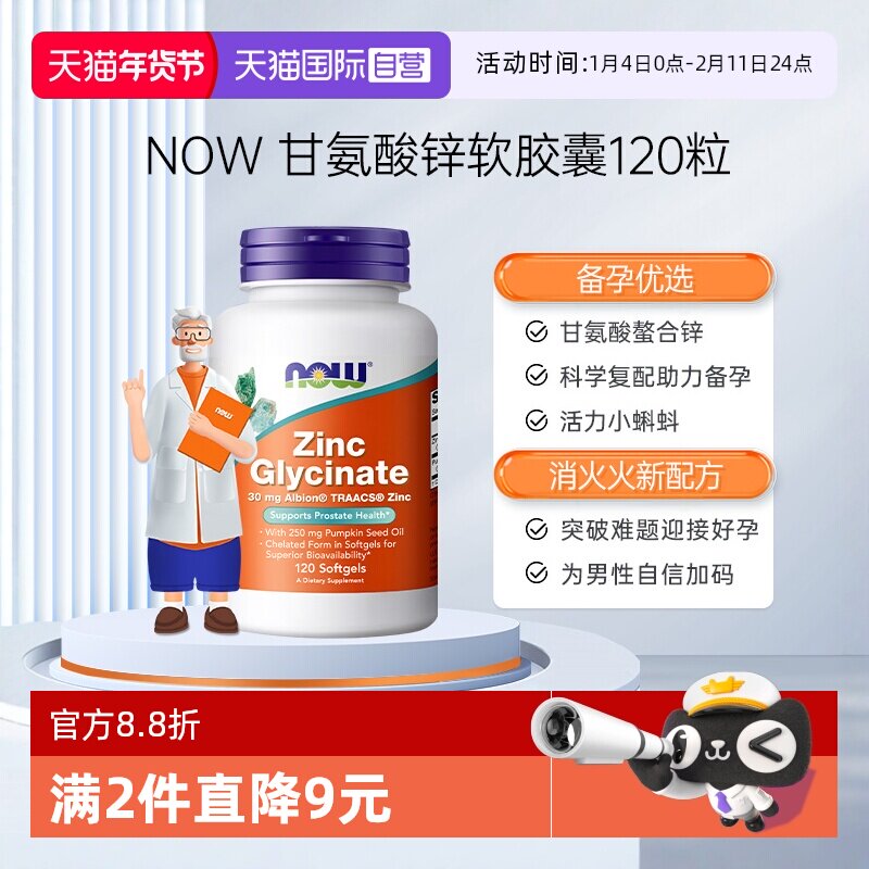 📚 【自营】NOW诺奥男性补锌甘氨酸锌zinc助力男士精子活力质量胶囊