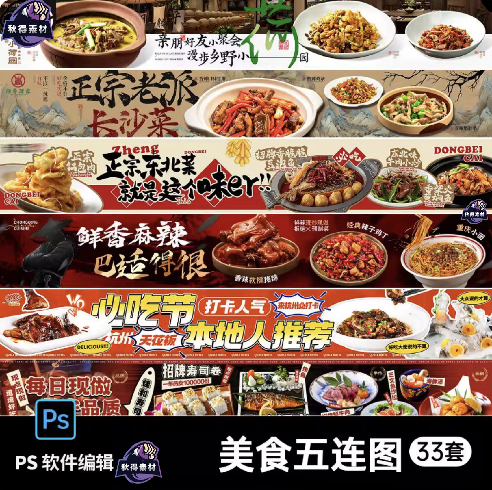 📚 开业美食烧烤餐饮大众点评商户通活动五连图banner海报PS设计素材