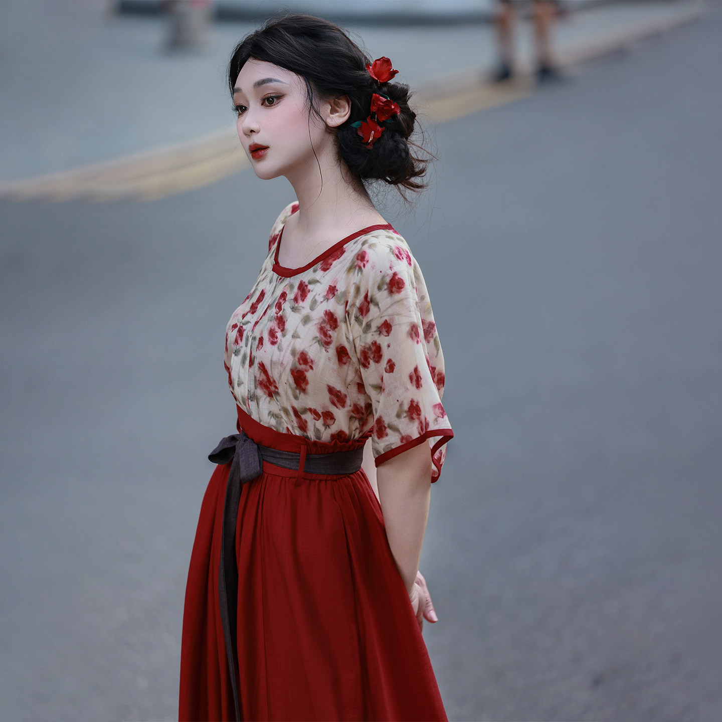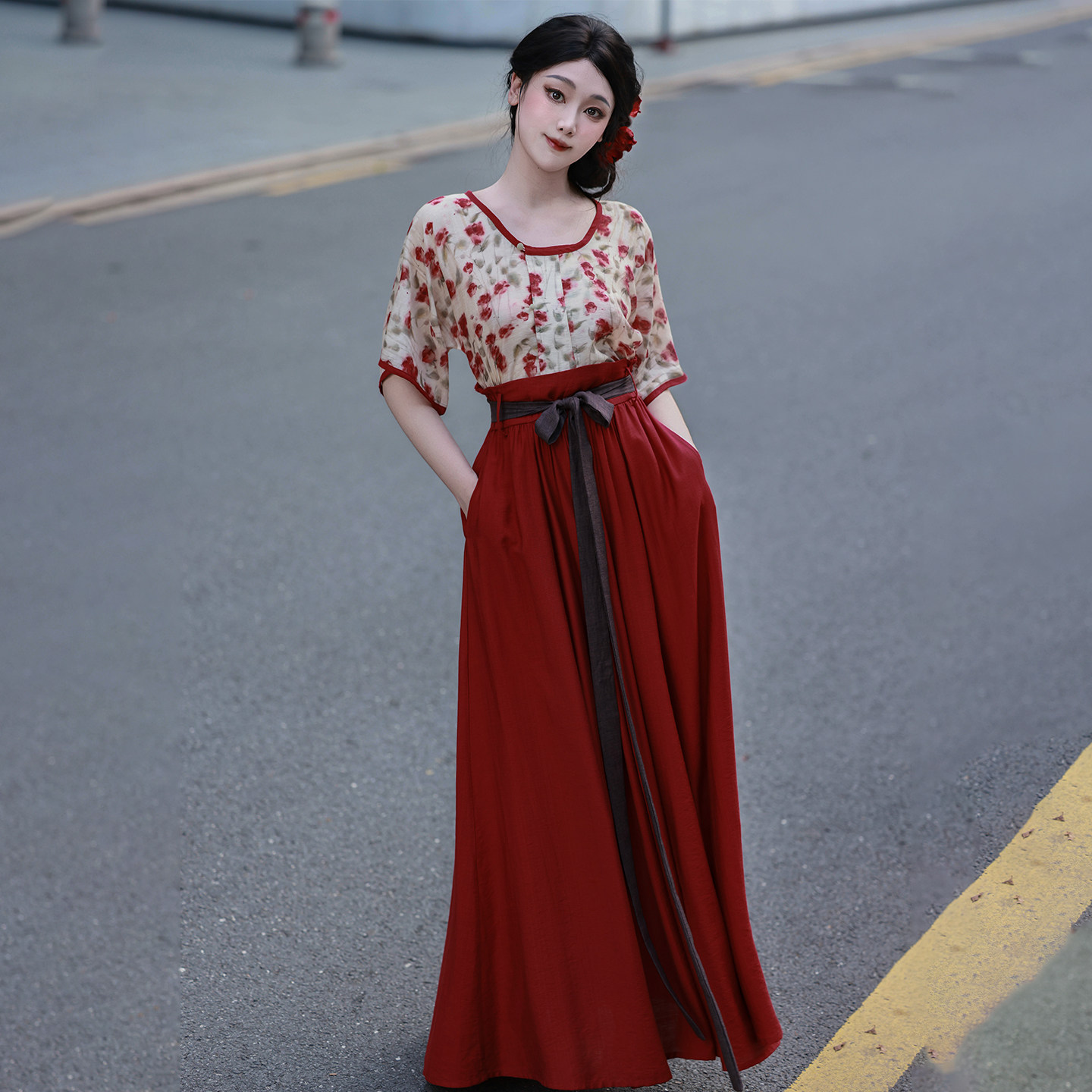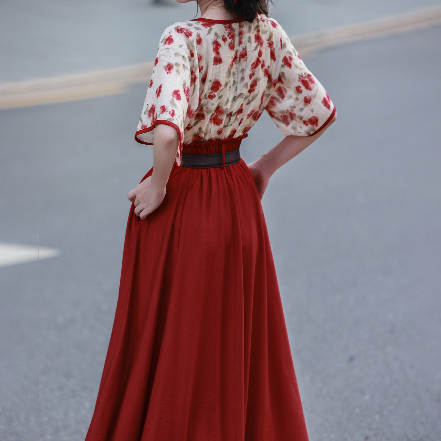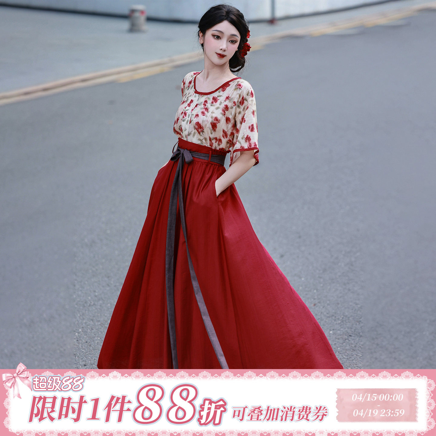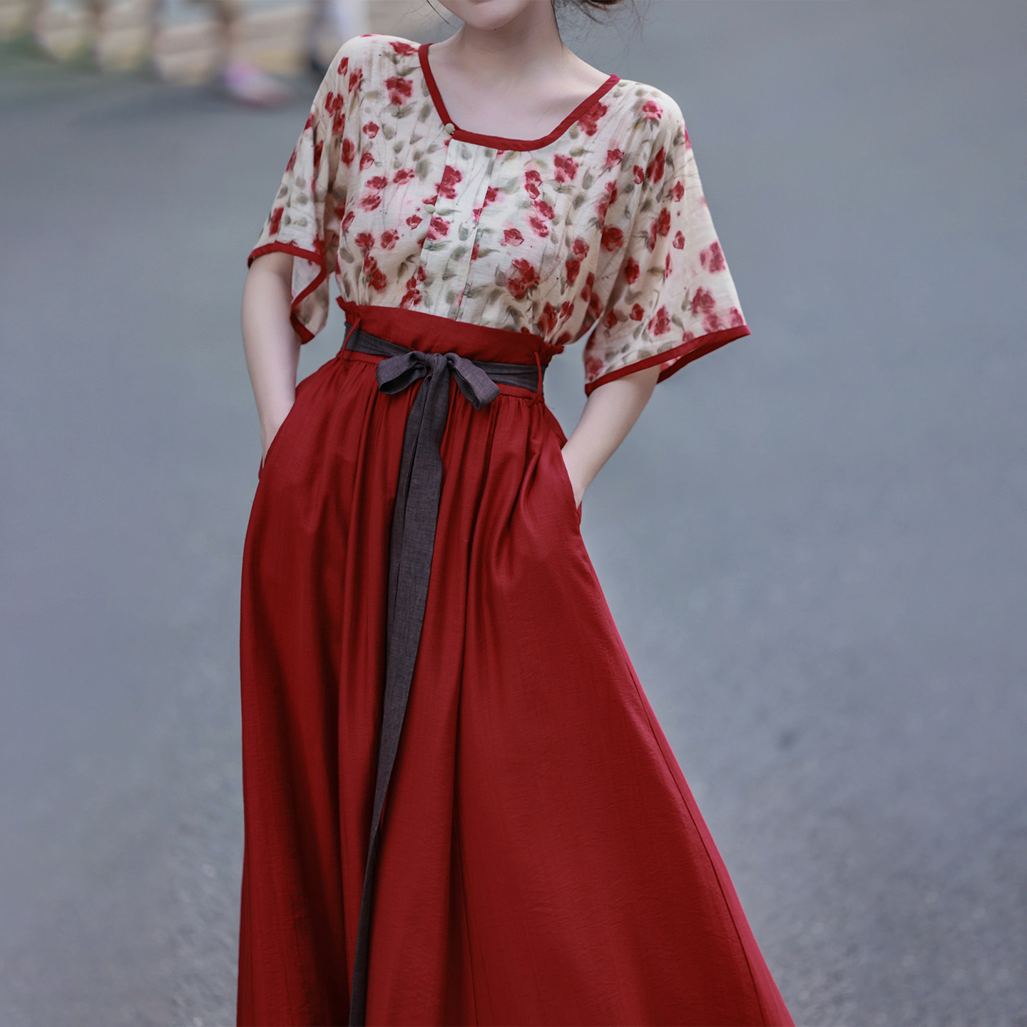 📚 拟梦玫瑰冰茶 原创唐背子汉元素半裙有口袋松紧人棉通勤日常明艳