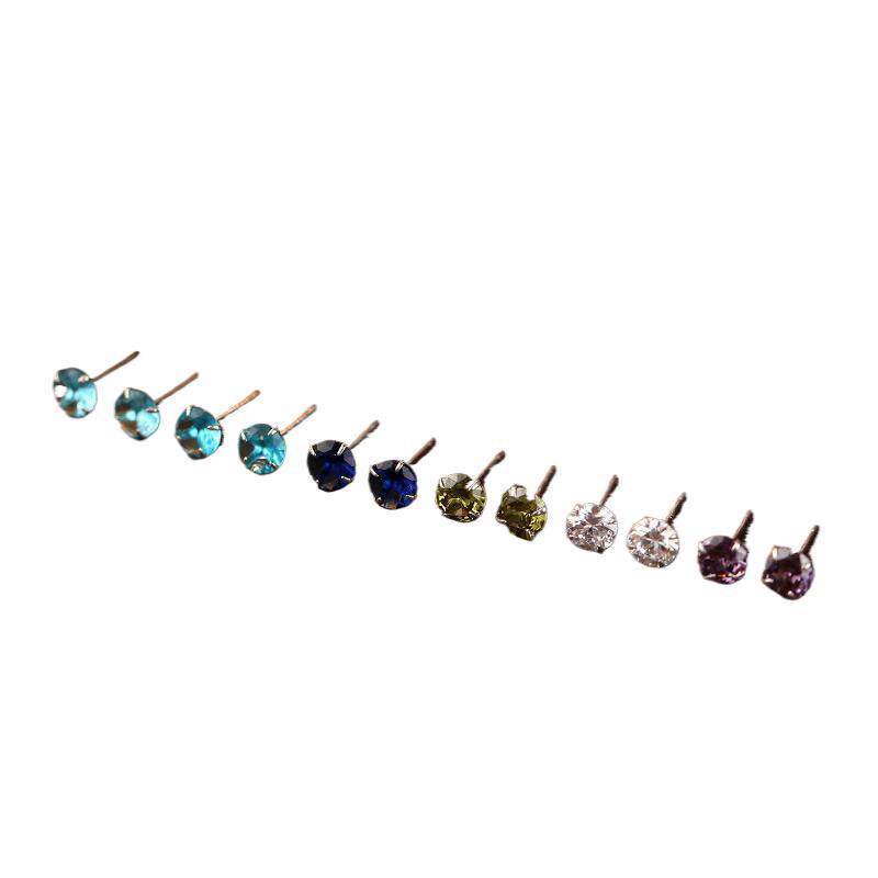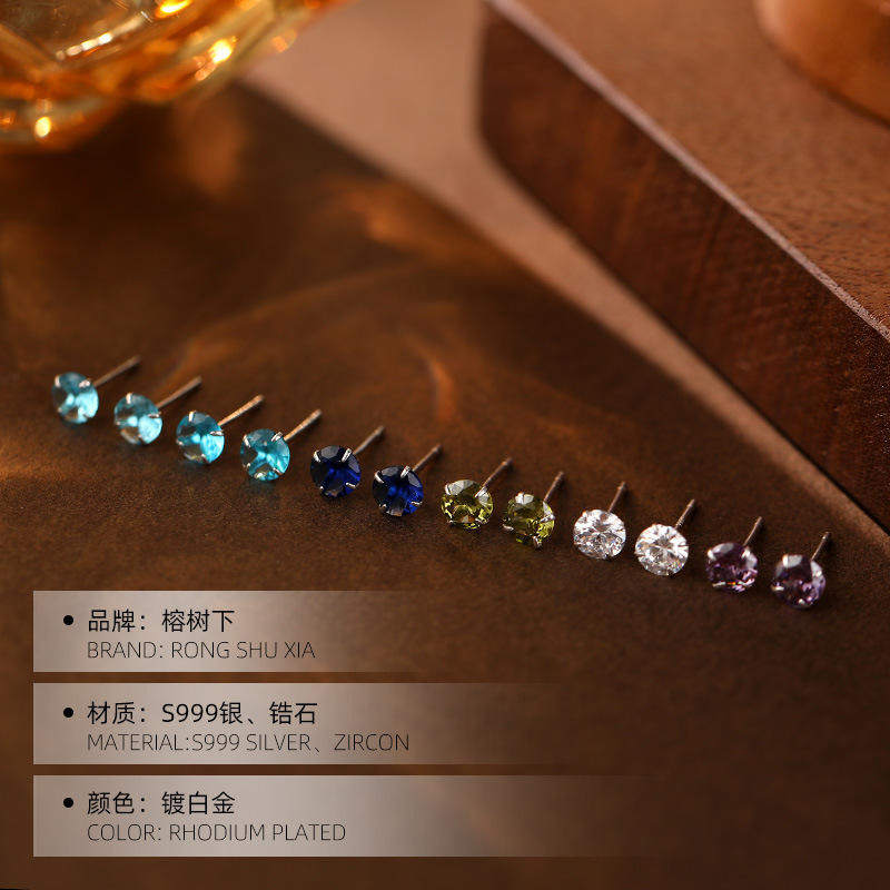 📚 新款榕树下S999银新品十二生辰石耳钉女养耳洞四爪彩钻耳饰日常百
