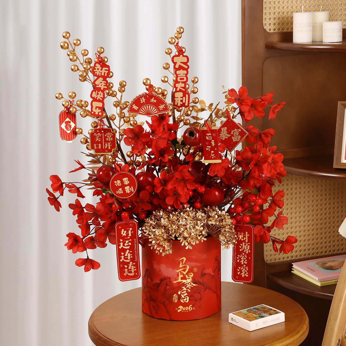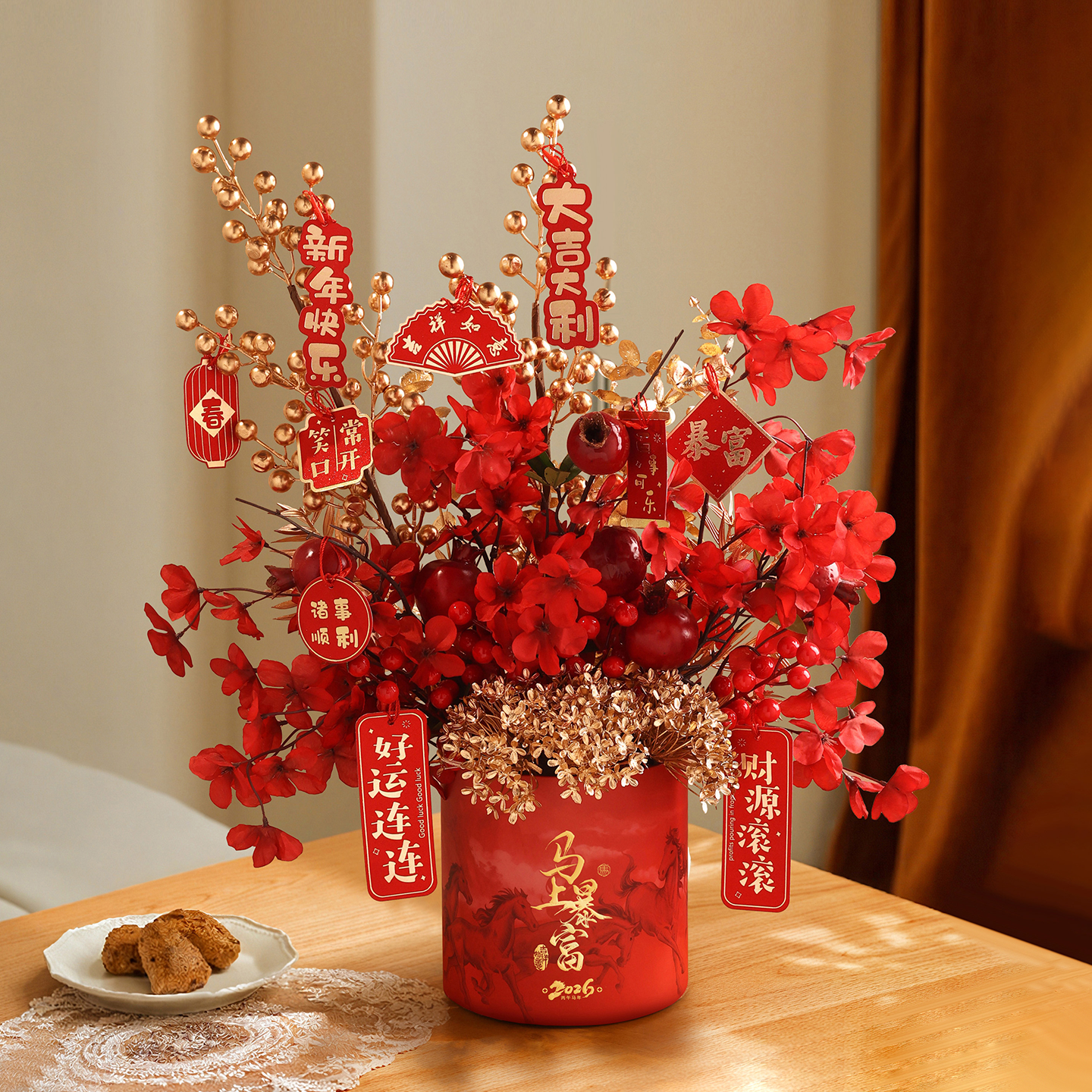 📚 石榴干花冬青红果仿真花假花年宵花抱抱桶过年福桶新年装饰沙发旁