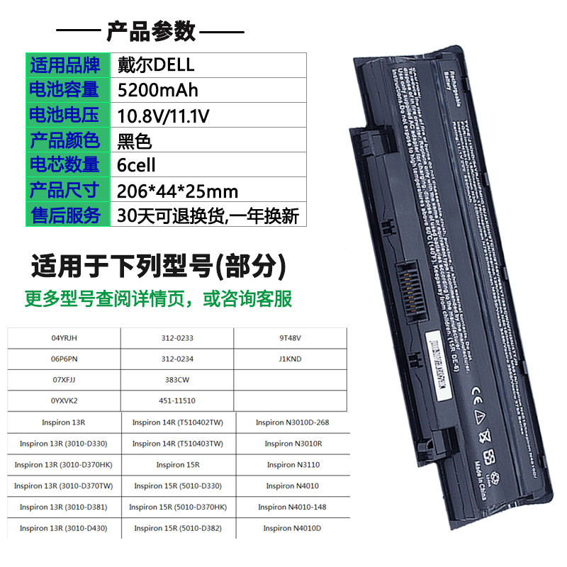 📚 通用戴尔n5110 n4010 n4110 n5010 n3010 14R 15笔记本电脑电池