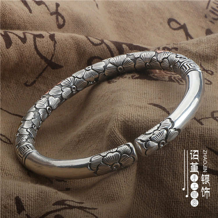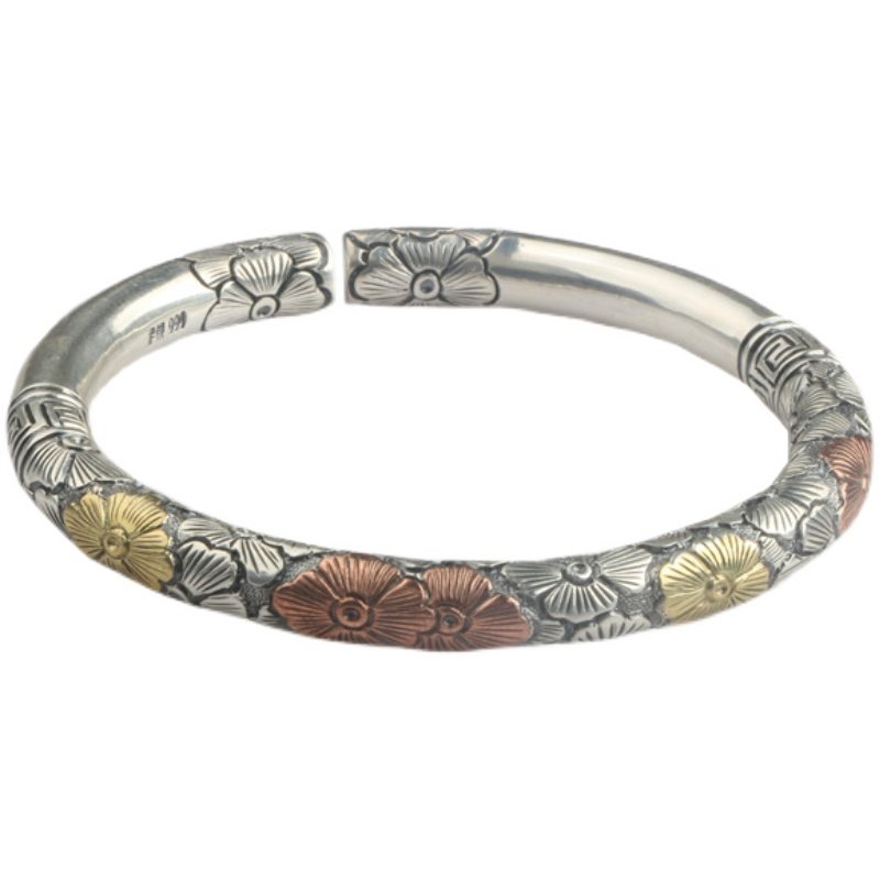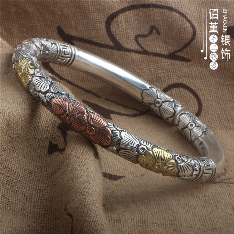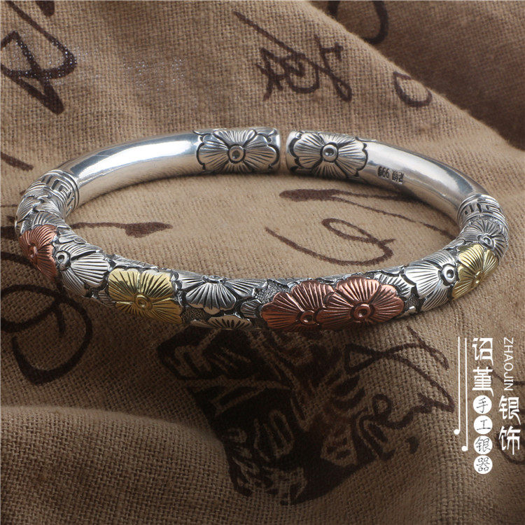 📚 梅花 999银手镯女纯银手工錾刻开口立体梅花浮雕金箍棒足银情侣镯