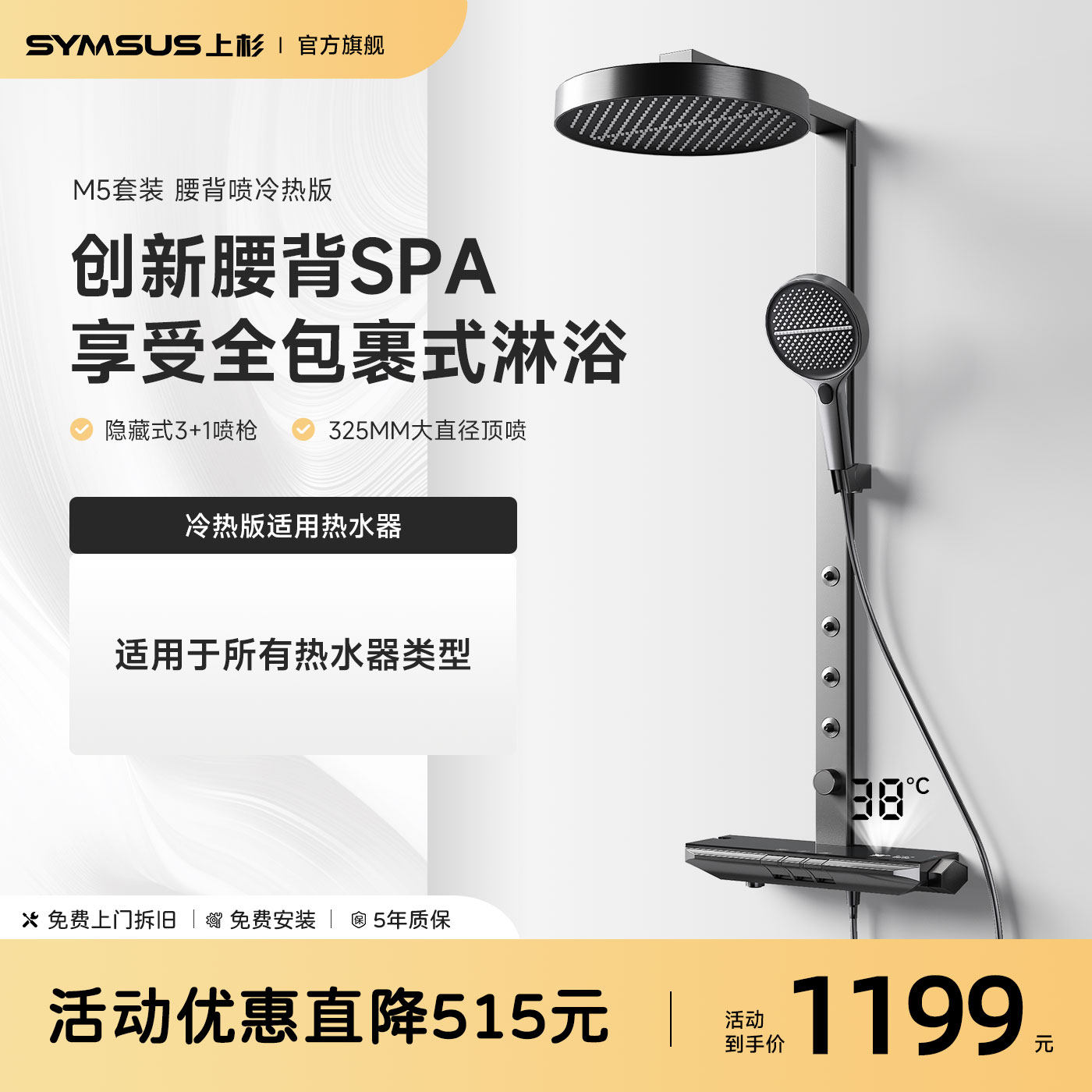 📚 上杉M5w-淋浴花洒套装增压顶喷奶白枪灰数显全铜数显恒温浴室