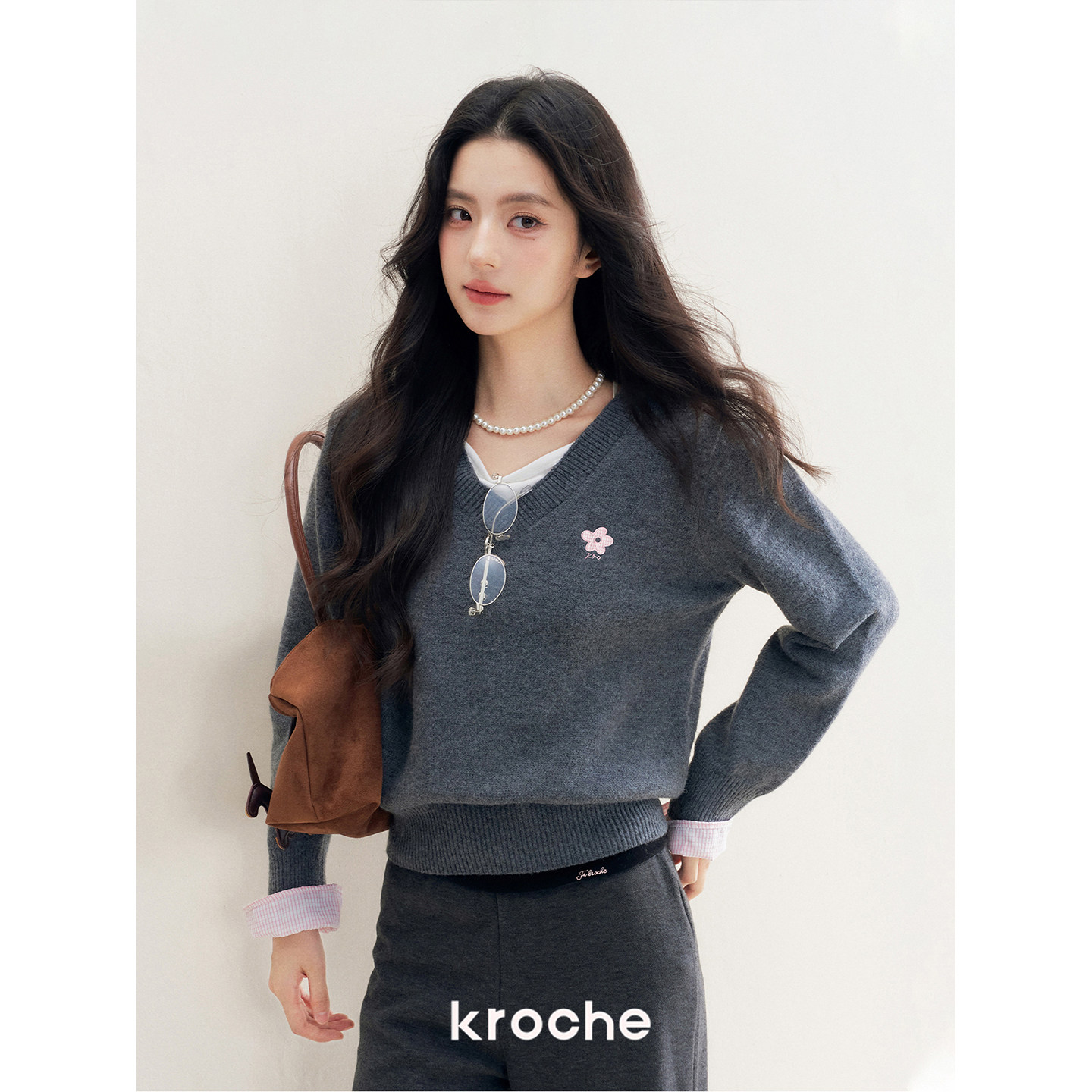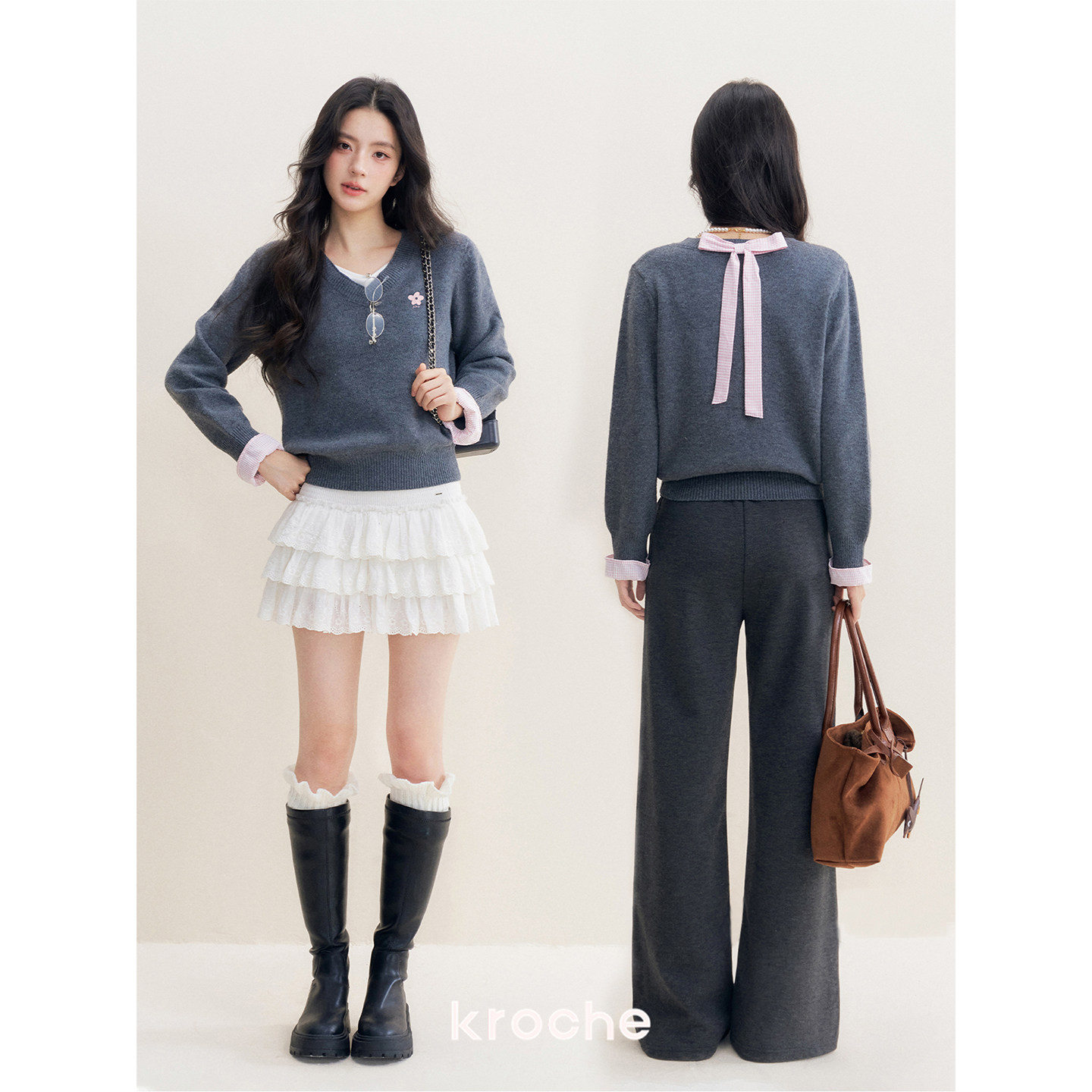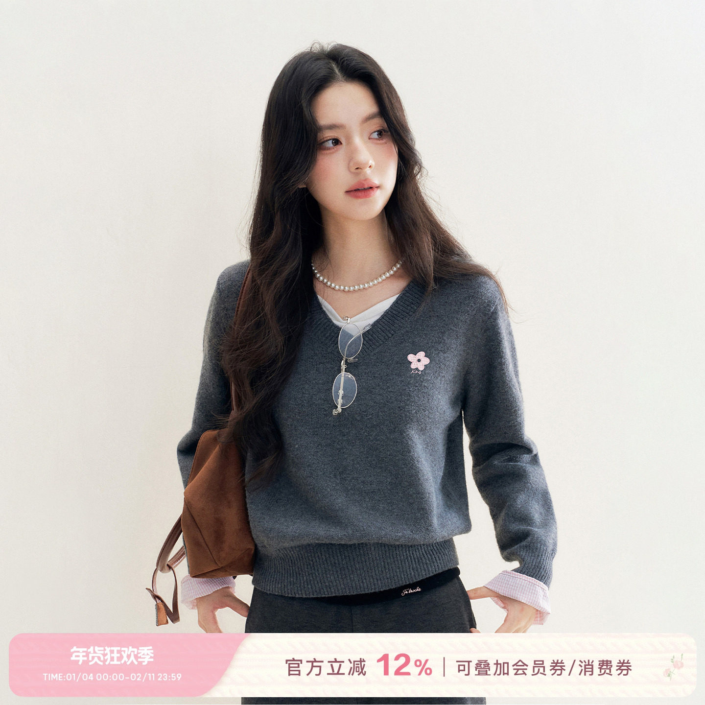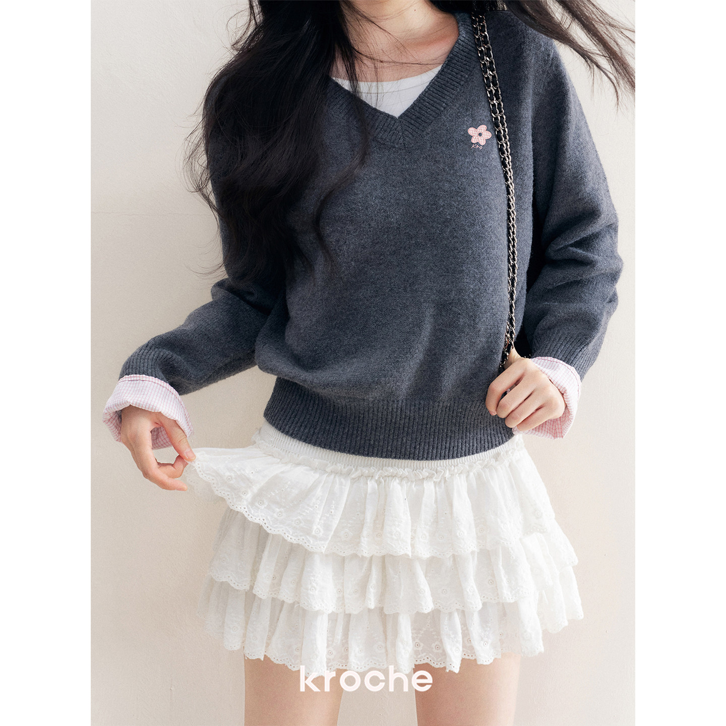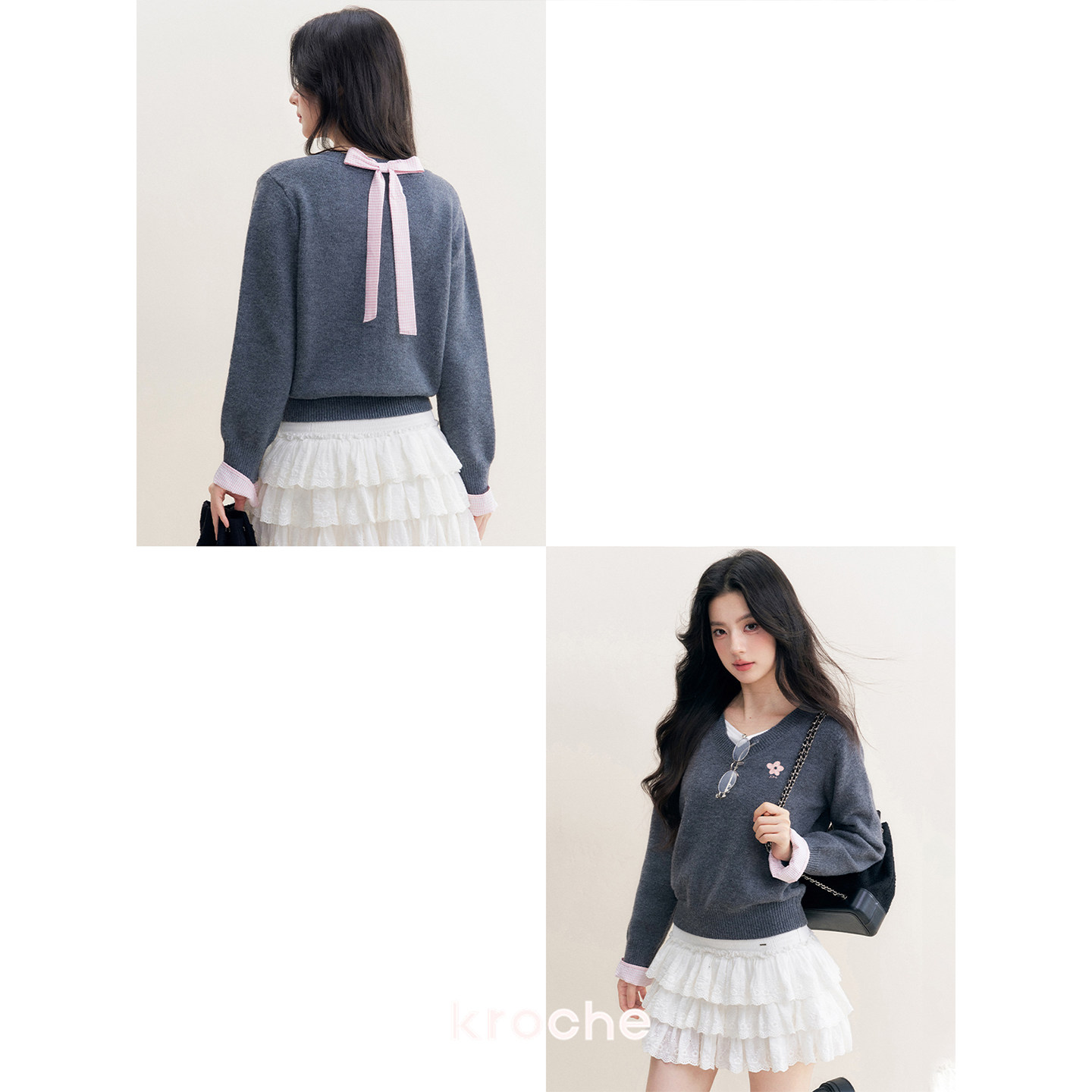 📚 Kroche 浪漫格调 羊毛混纺 假两件格纹拼接花灰色v领毛衣
