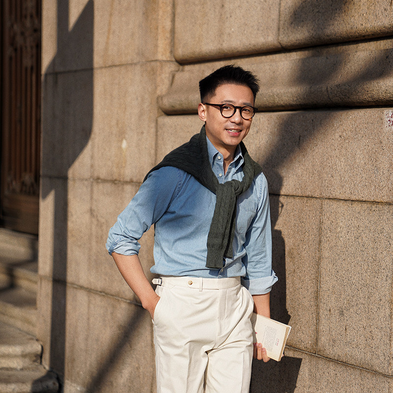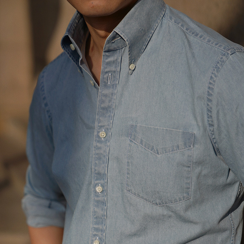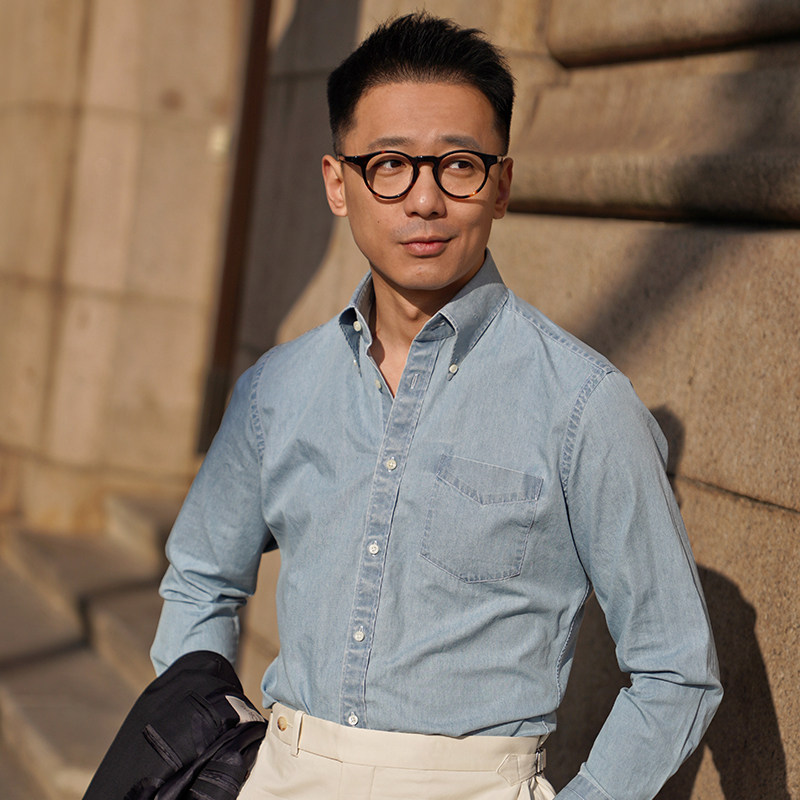 📚 CM那不勒斯皇后淡蓝全棉重水洗牛仔意式BD领明扣休闲工装衬衫
