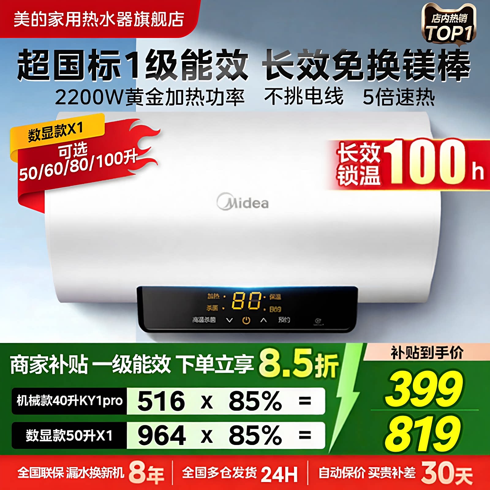 📚 美的出品华凌电热水器家用一级省电50/60升储水式速热大水量洗澡