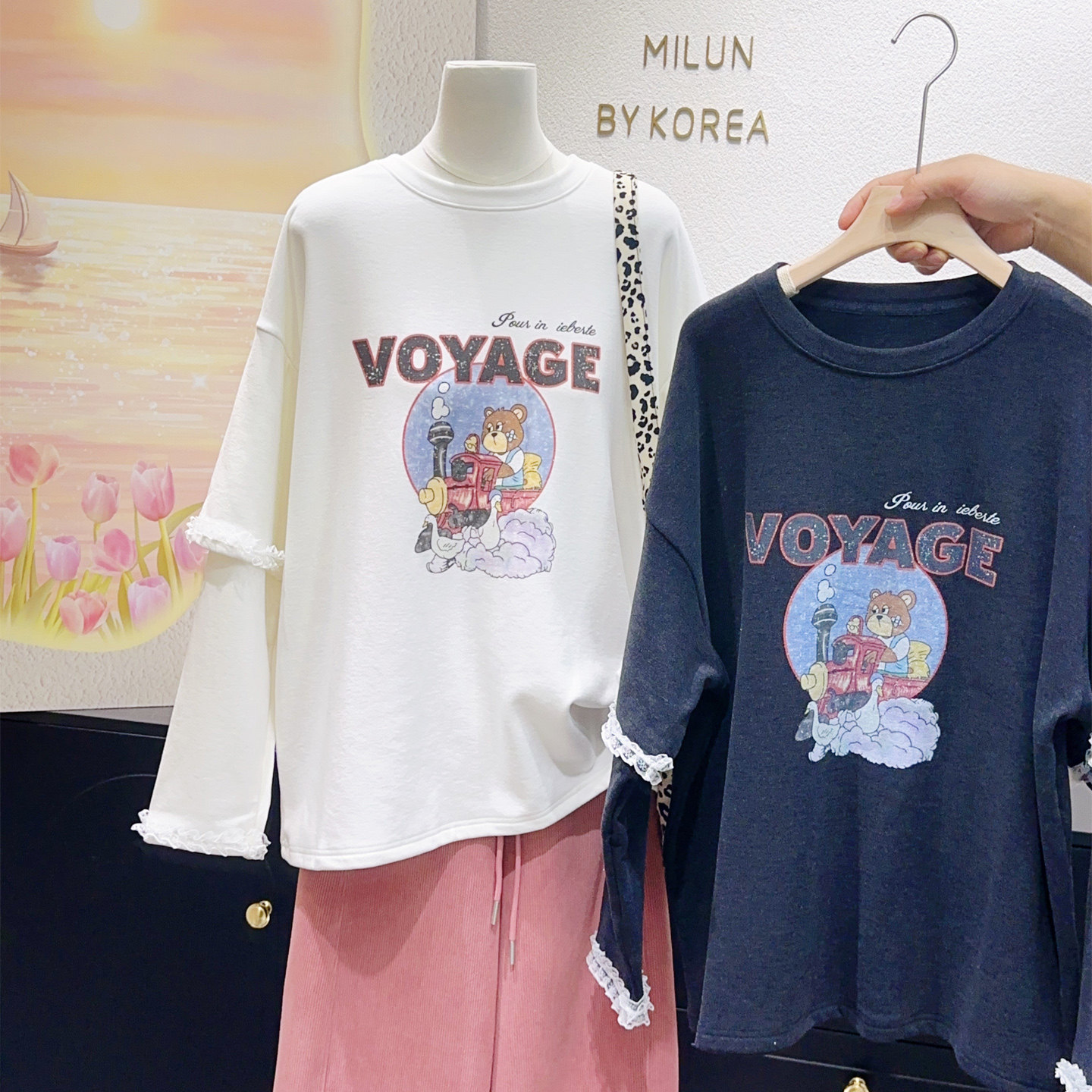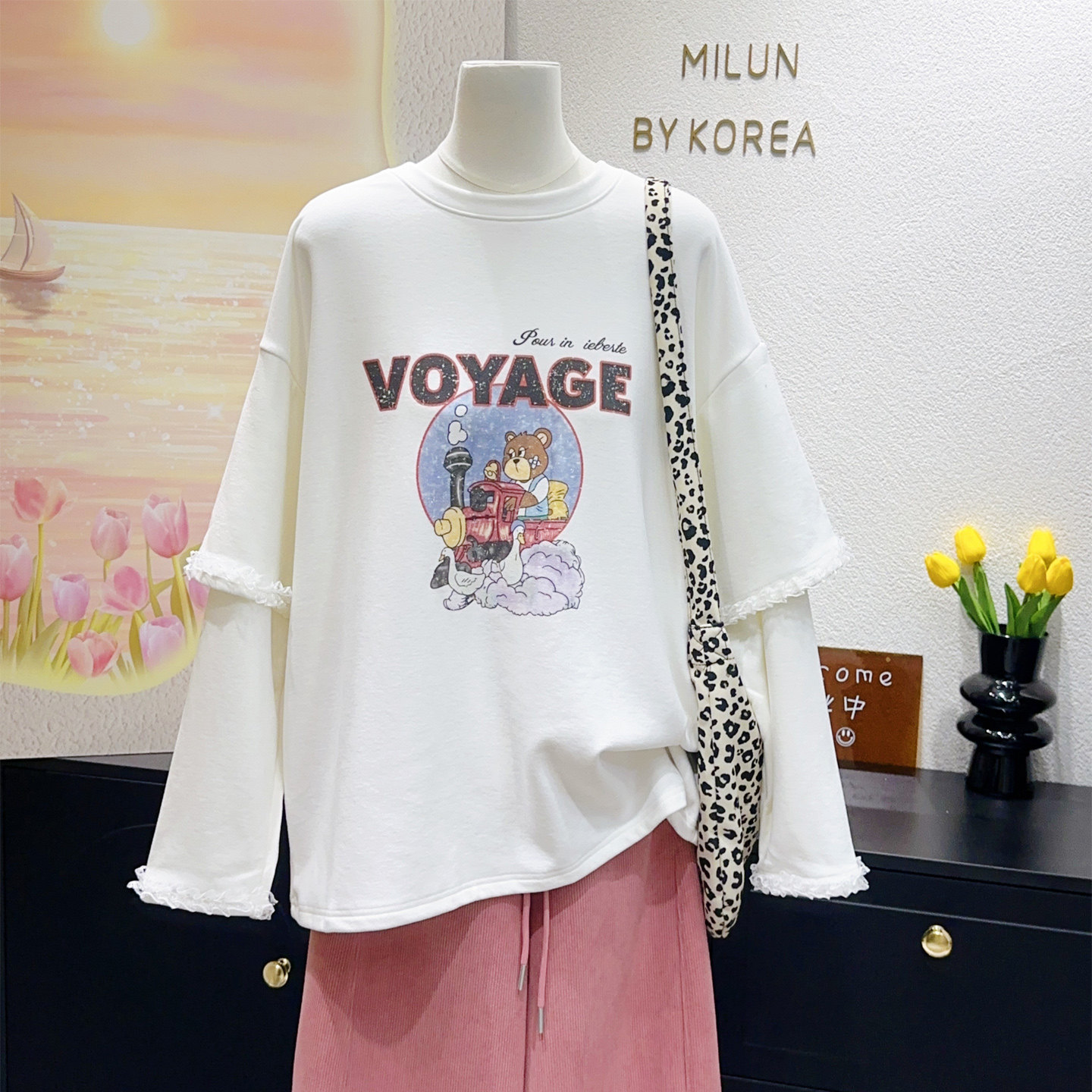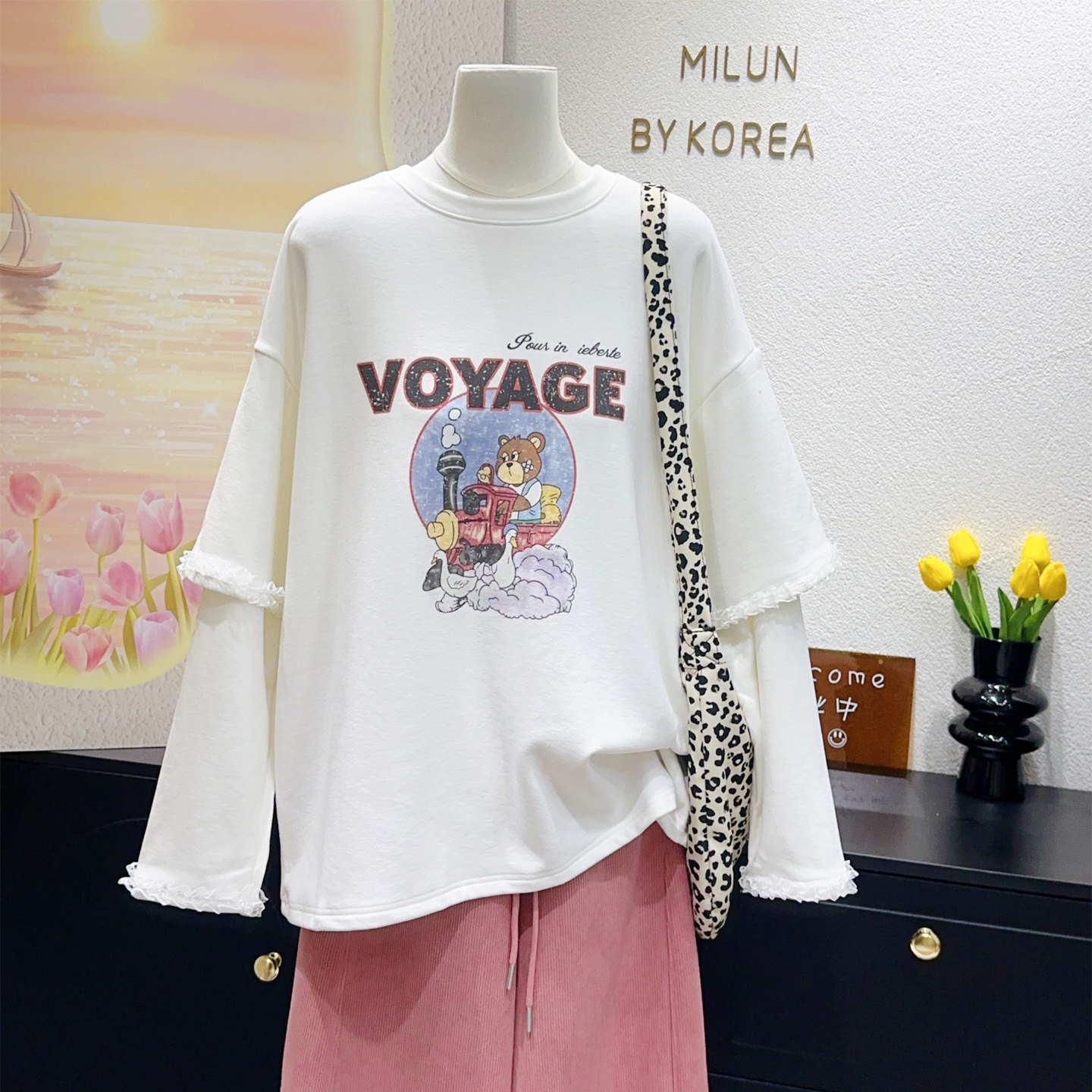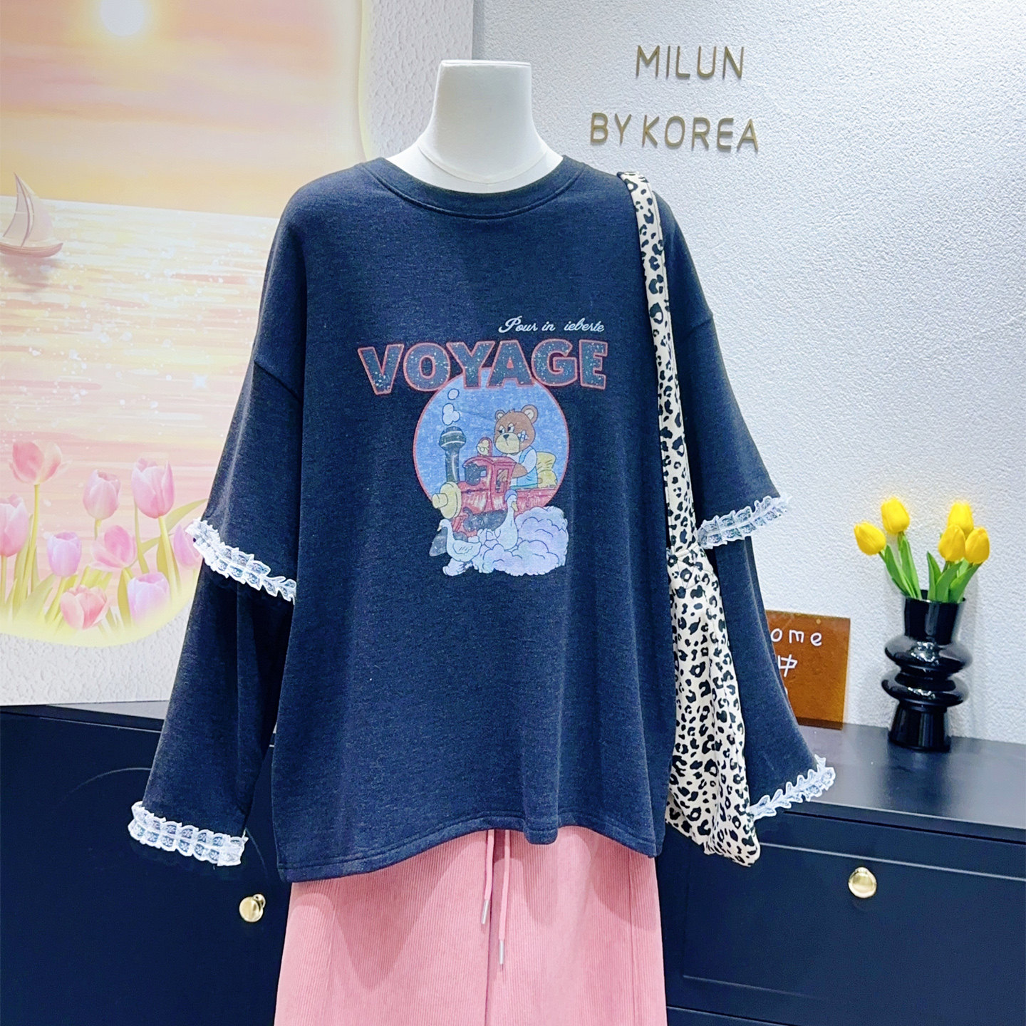 📚 韩国东大门上衣~减龄休闲松弛感假两件长袖木耳边蕾丝袖上衣大码
