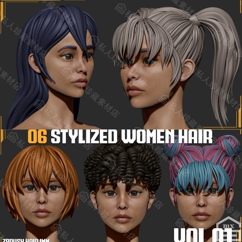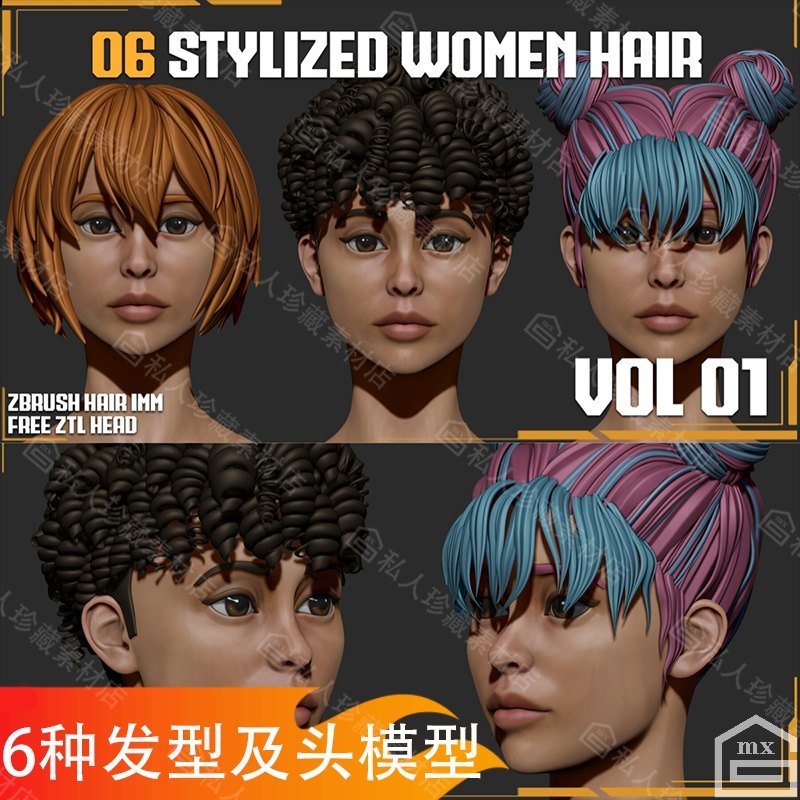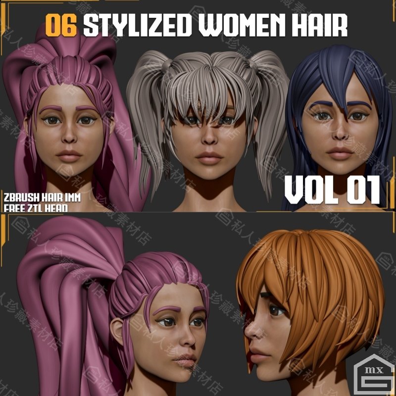 📚 zbrush风格化女性发型头发毛发imm笔刷zb卷发头像头部3D模型ztl
