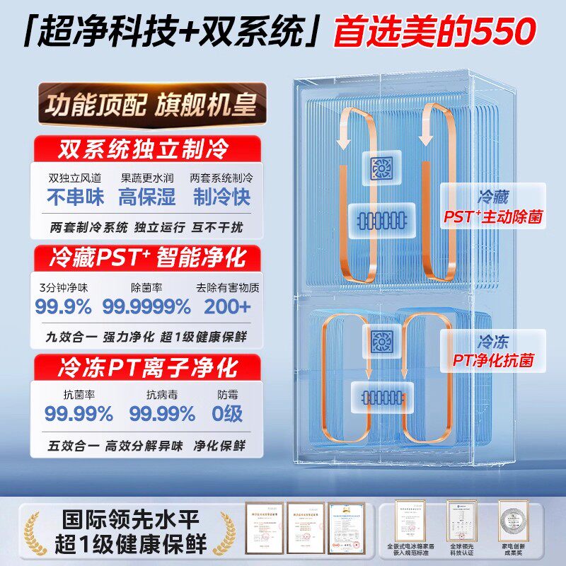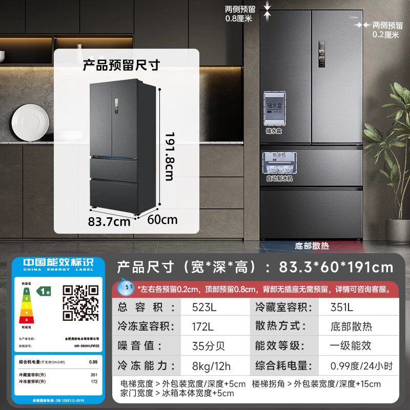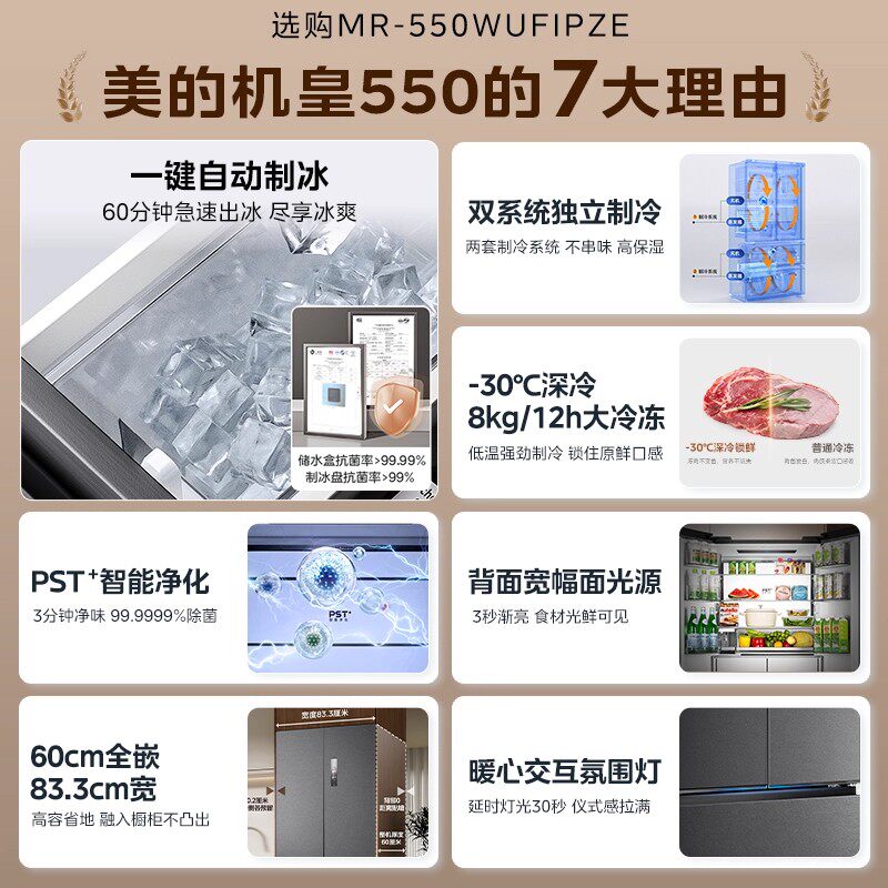 📚 Midea/美的 MR-550WUFIPZE双系统零嵌自动制冰60cm冰箱法式双开门
