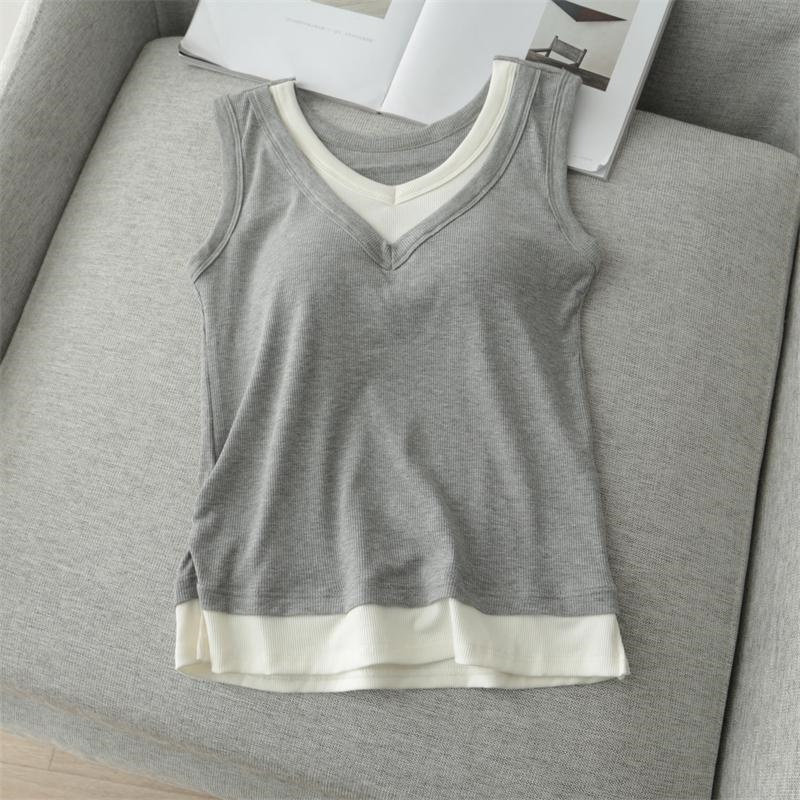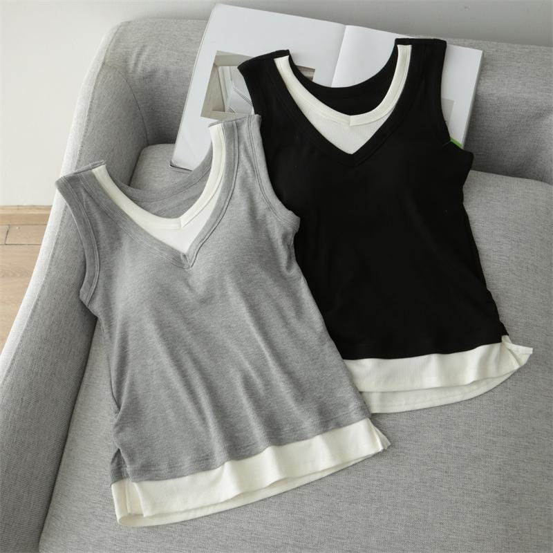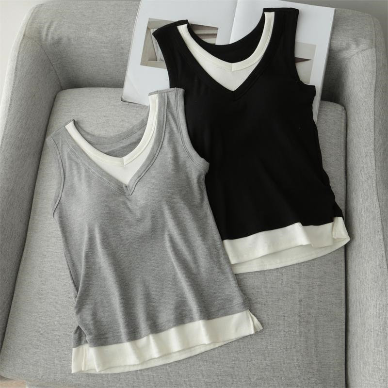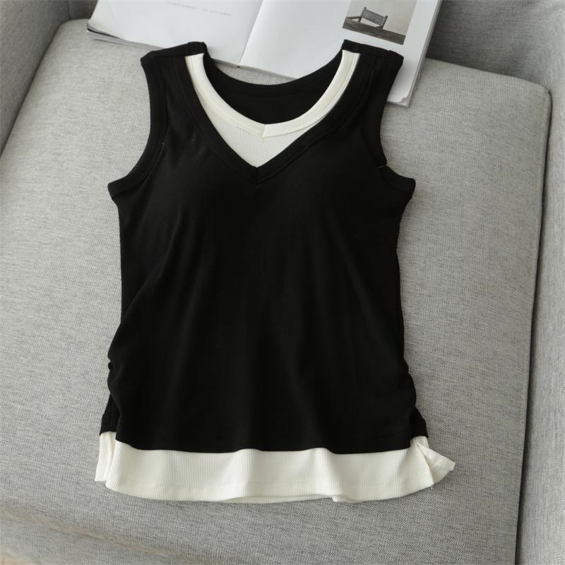 📚 300斤修身撞色假两件吊带背心大码V领不可拆卸一体胸垫外穿上衣女
