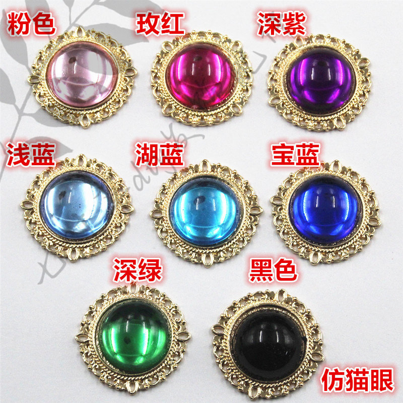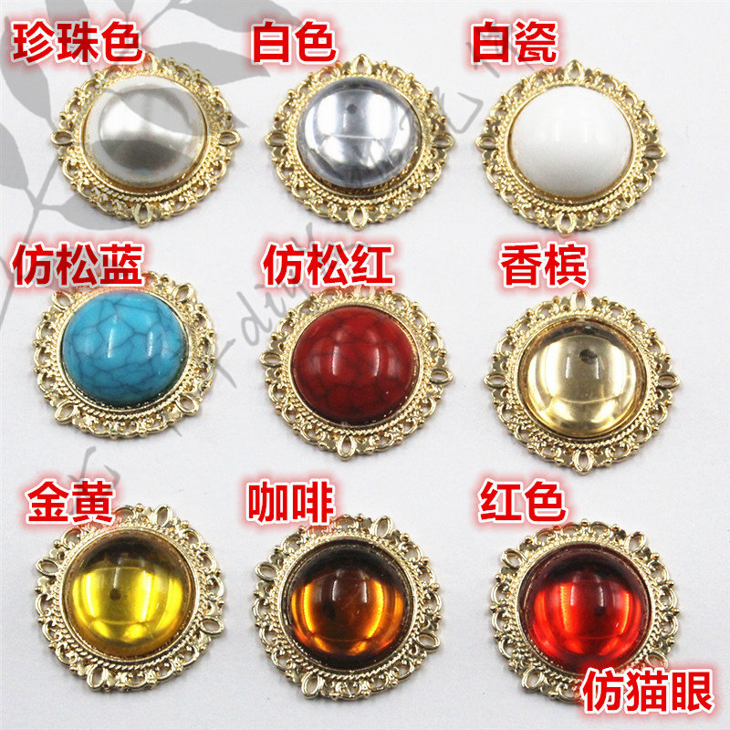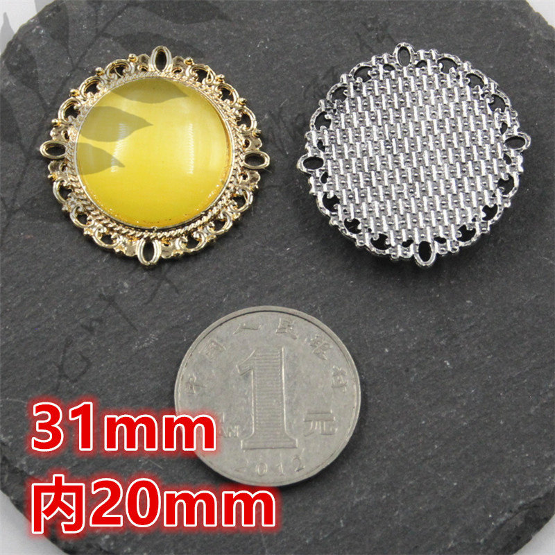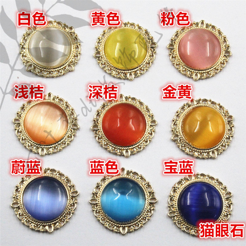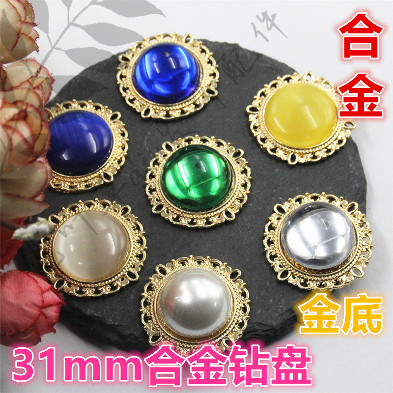 📚 (金底)31mm圆形花边合金钻盘内镶20mm猫眼石仿松石饰品配件材料
