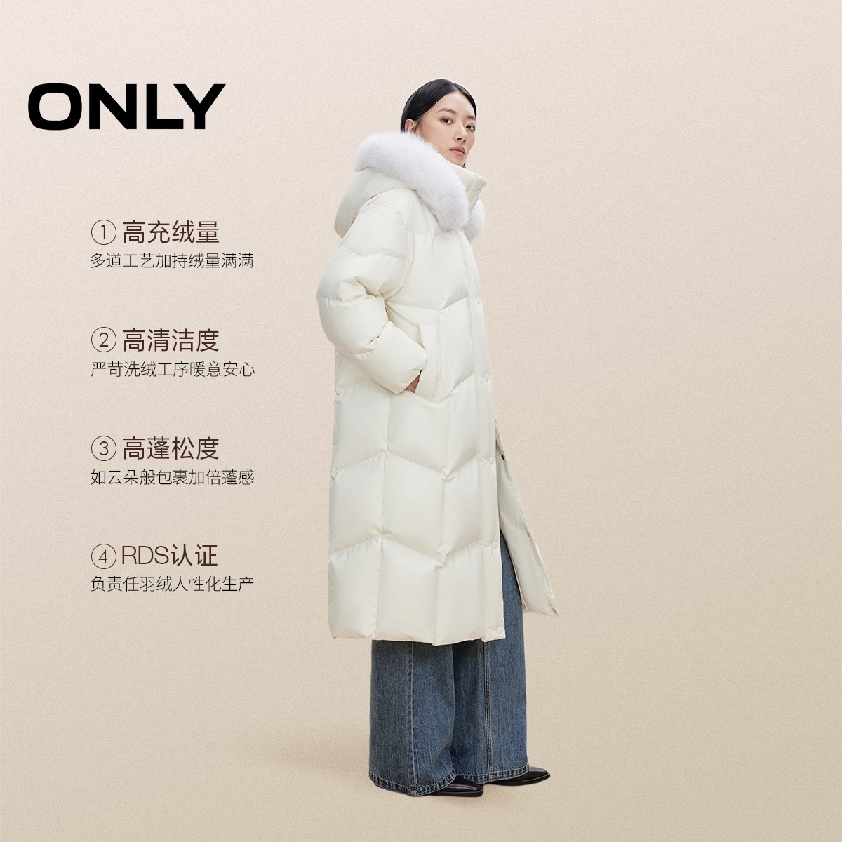 📚 【鹅绒服】ONLY冬季通勤风轻奢狐狸毛领收腰长款过膝盖羽绒服女