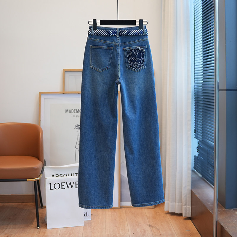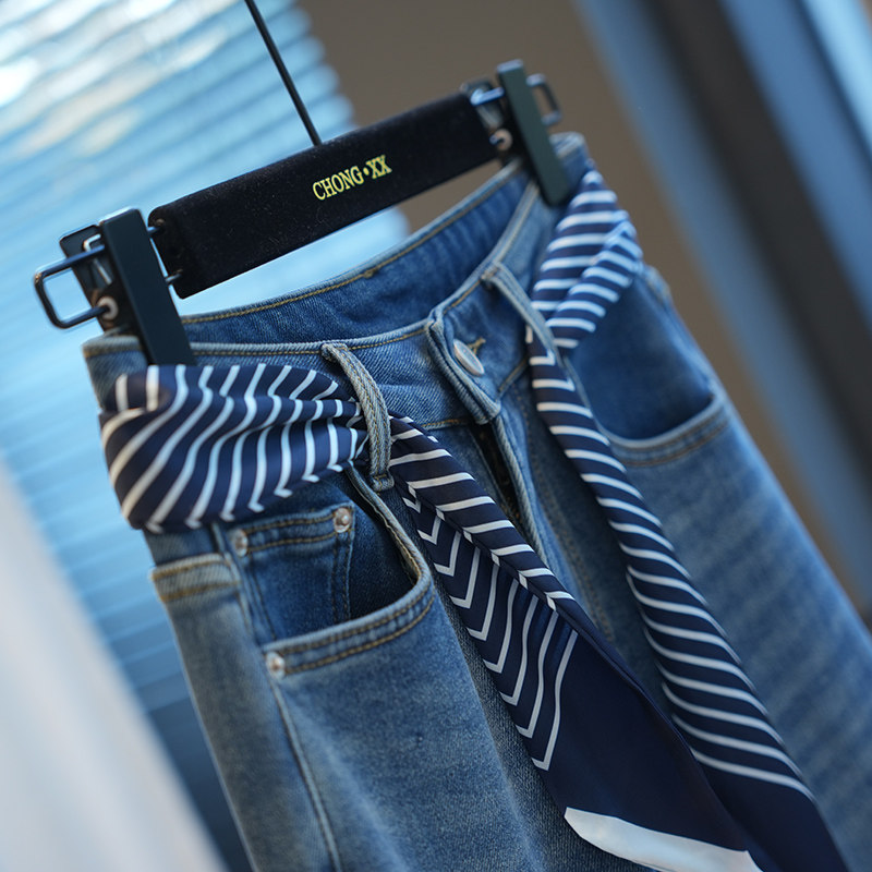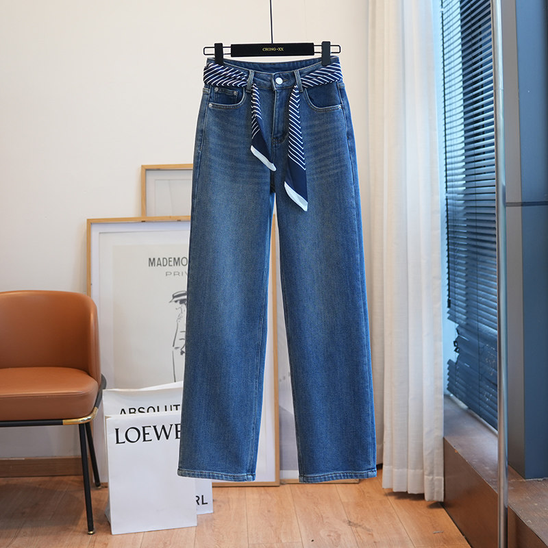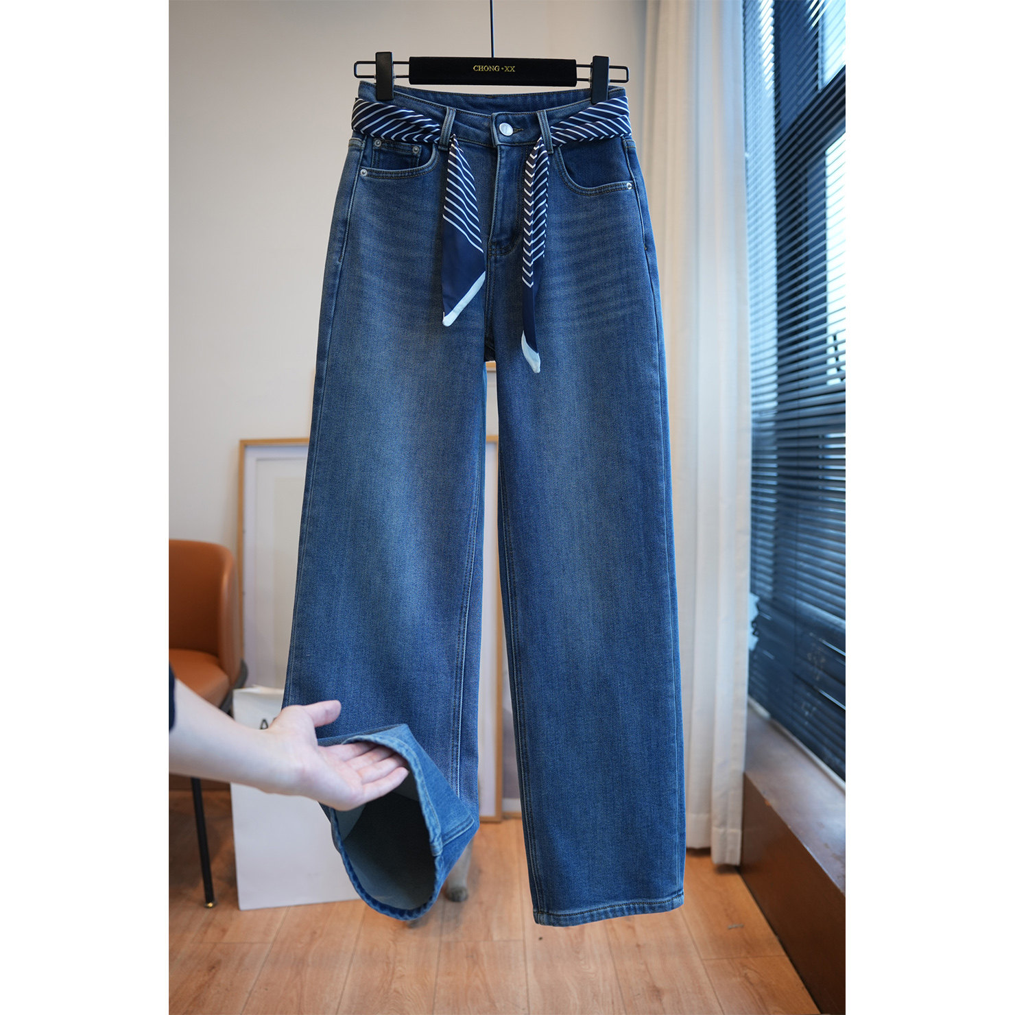 📚 赠丝巾飘带!休闲高腰显瘦宽松直筒窄版牛仔裤女加绒长裤秋冬A76K