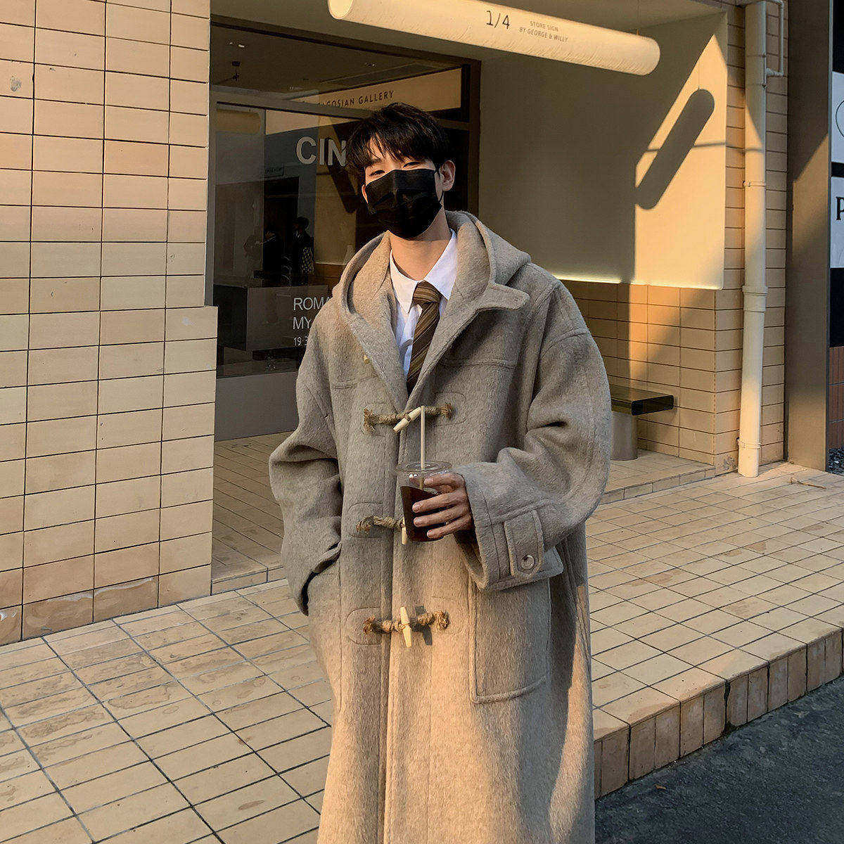 📚 白口阳【休斯顿高校】羊毛牛角扣加厚连帽呢大衣男韩版毛呢外套冬