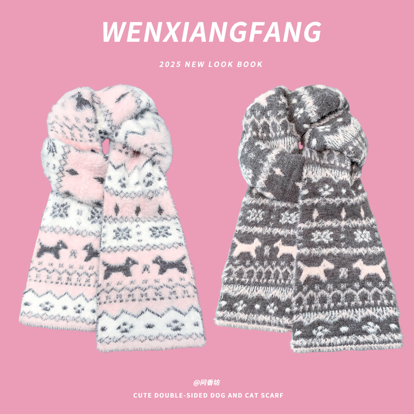 📚 费尔岛双面可爱猫咪针织围巾女秋冬加厚保暖防寒防风学生护颈围脖