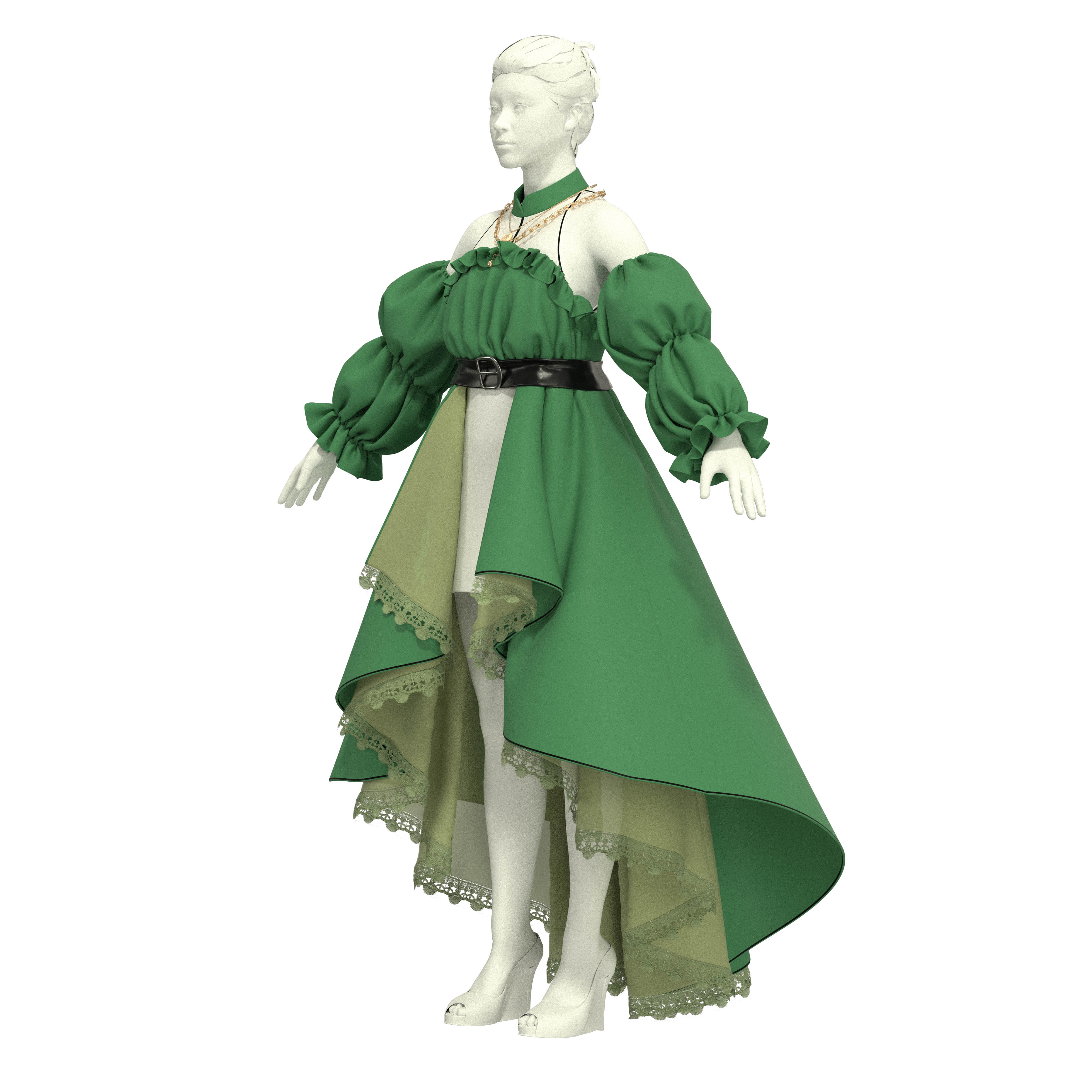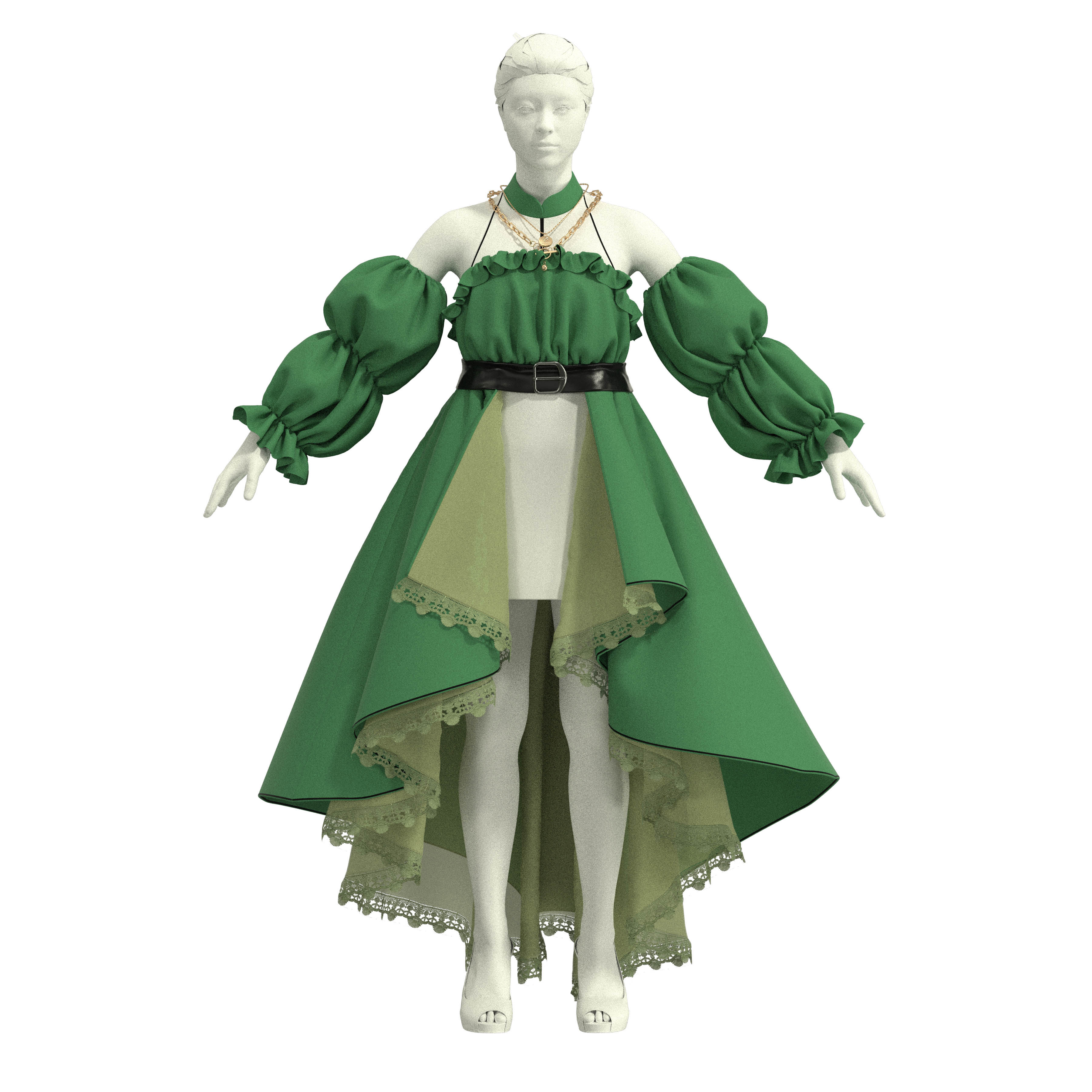 📚 1433 绿色大摆拖尾裙纸样 立领显瘦连衣裙图纸 如图 1比1 3D样衣