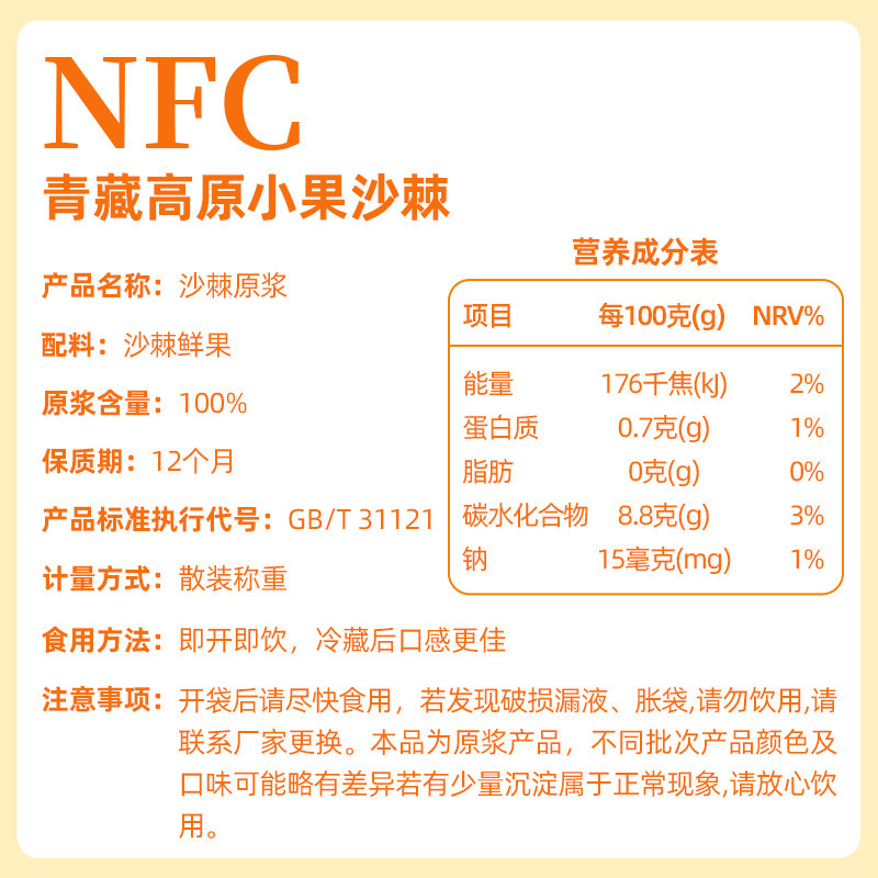 📚 一方仙品NFC沙棘原浆生榨高原非提油小果沙棘汁纯原液238g定量装