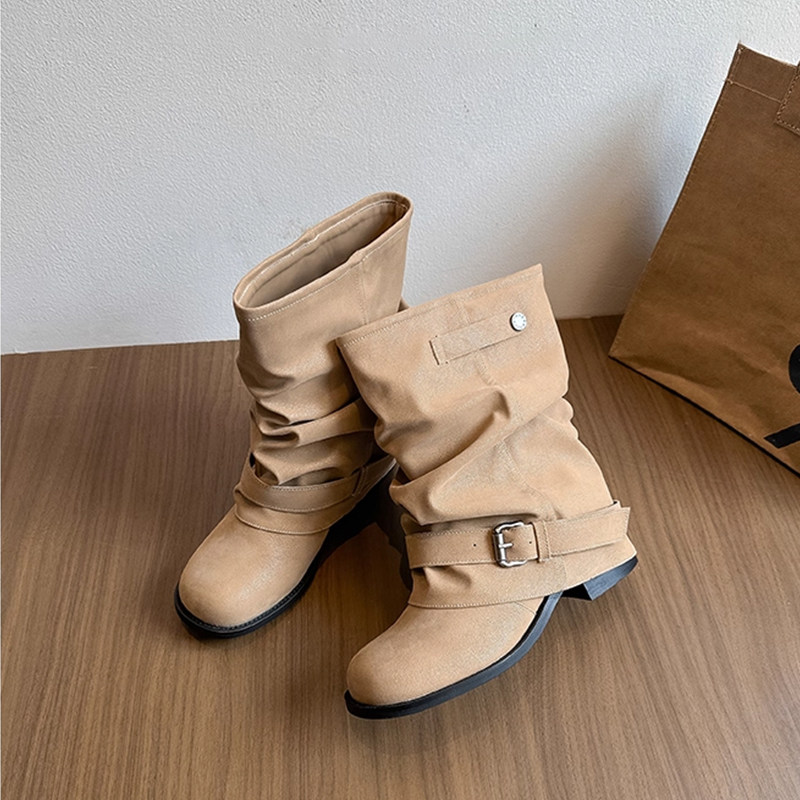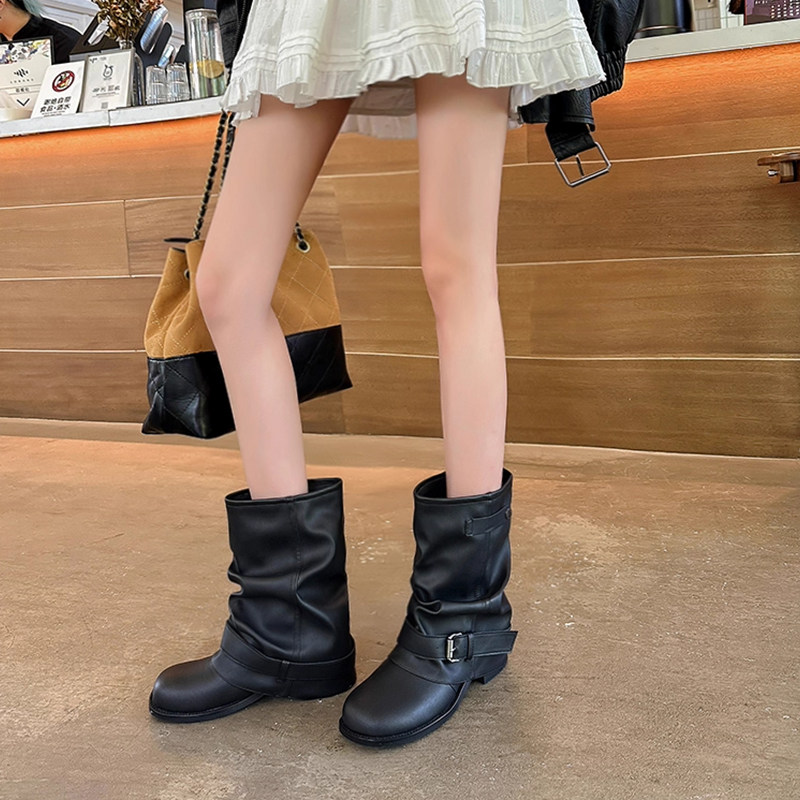 📚 西部牛仔裤管短靴女2025新款秋季粗跟褶皱堆堆靴复古英伦风马丁靴