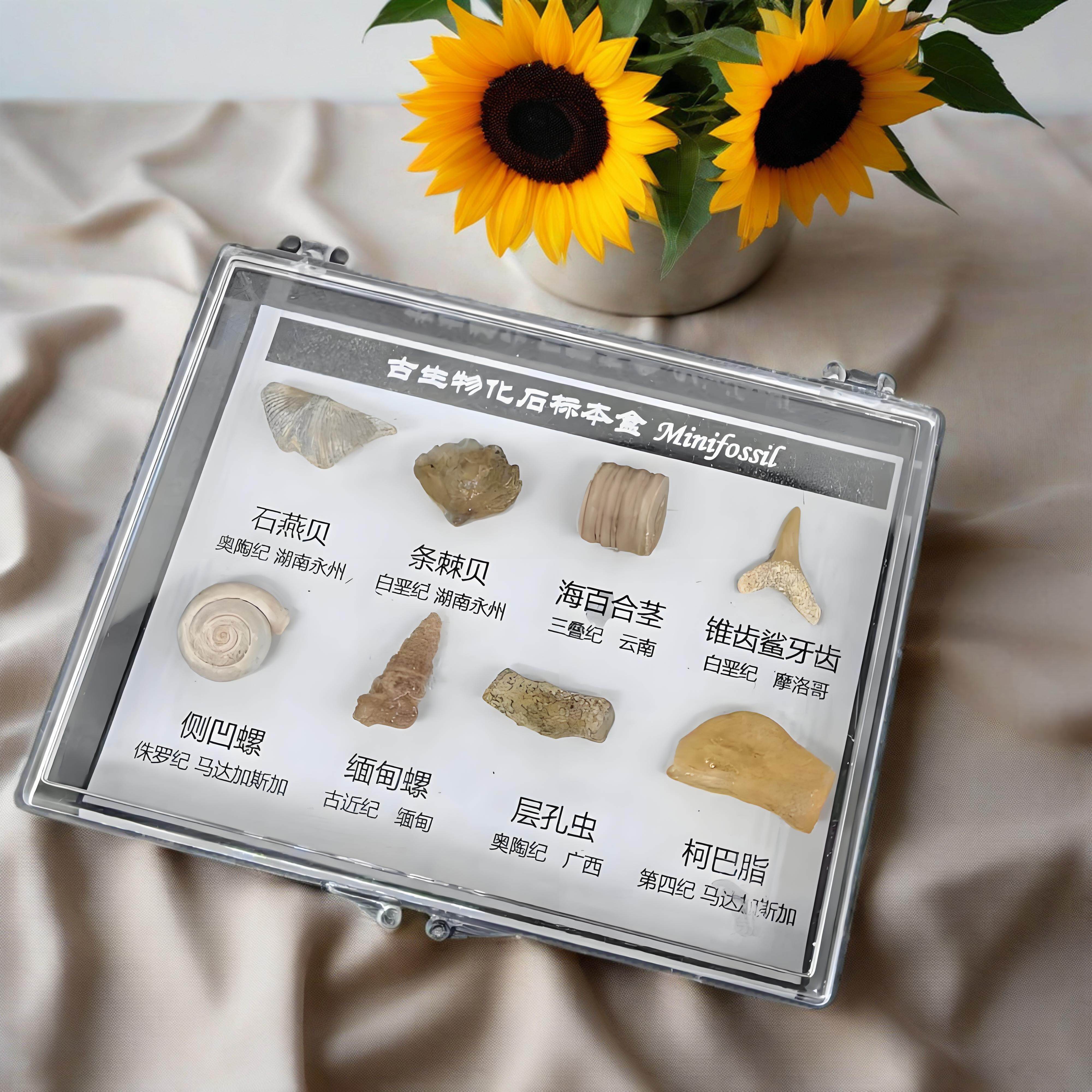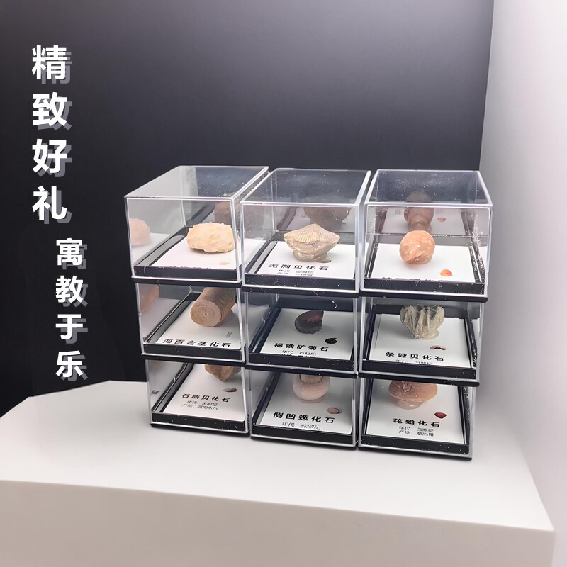📚 天然古生物化石原石标本盒科普收藏礼物贝壳三叶虫菊石牙齿冰箱贴