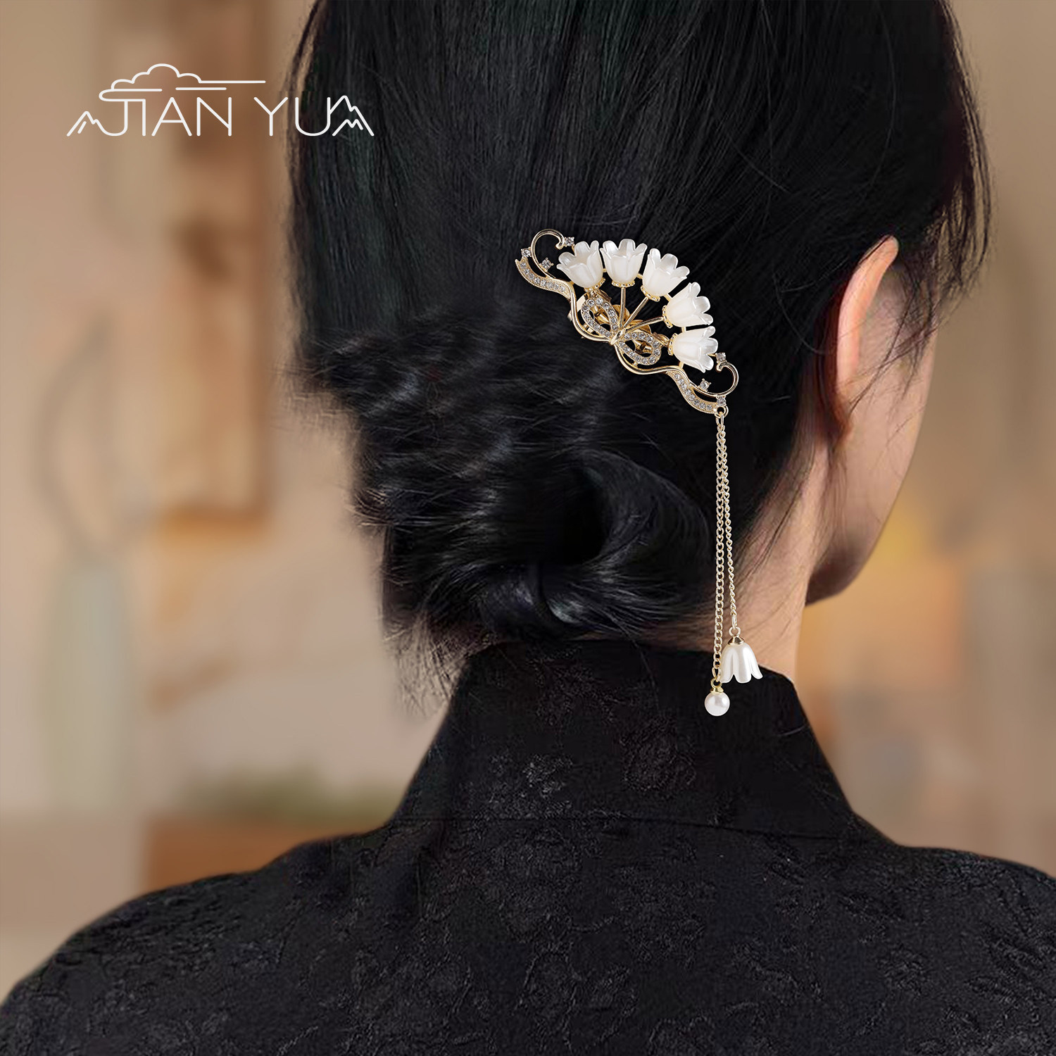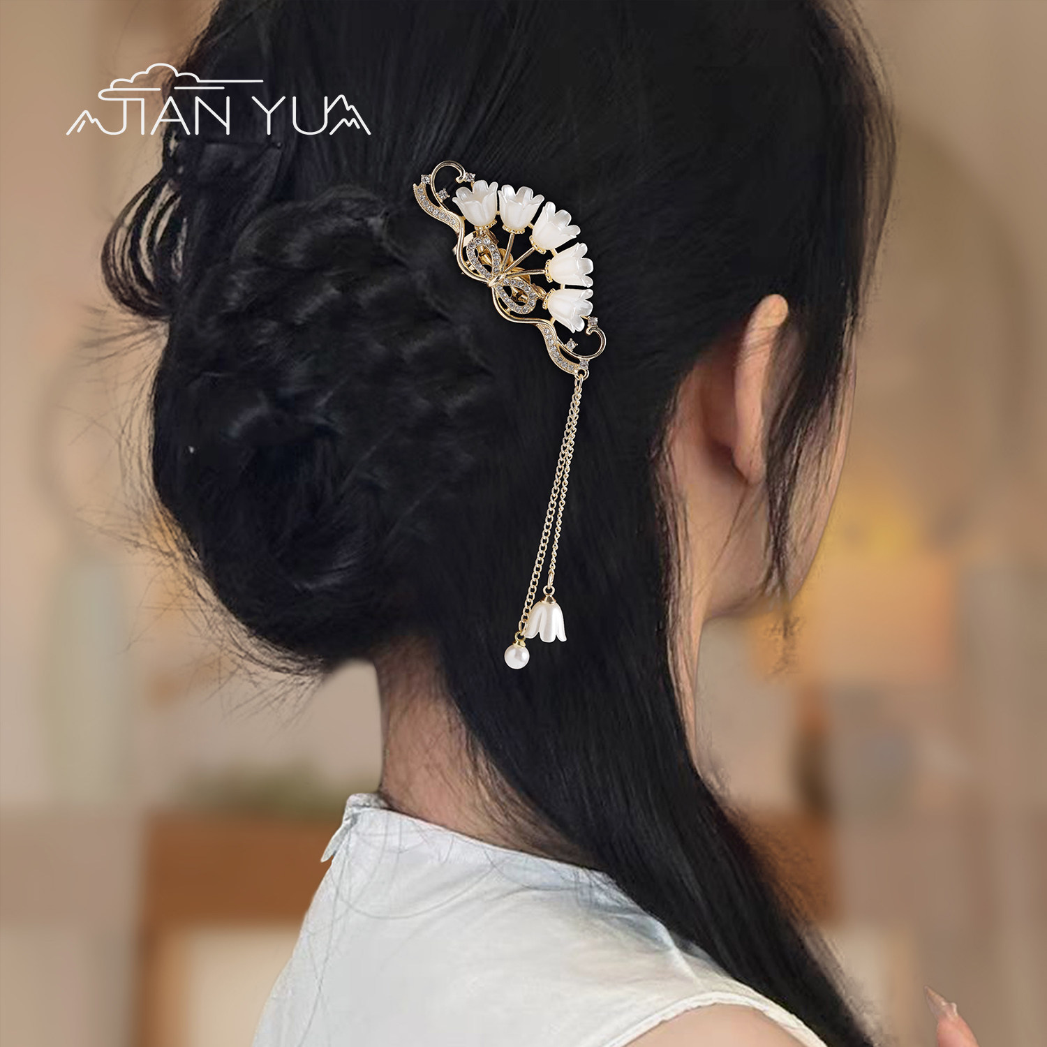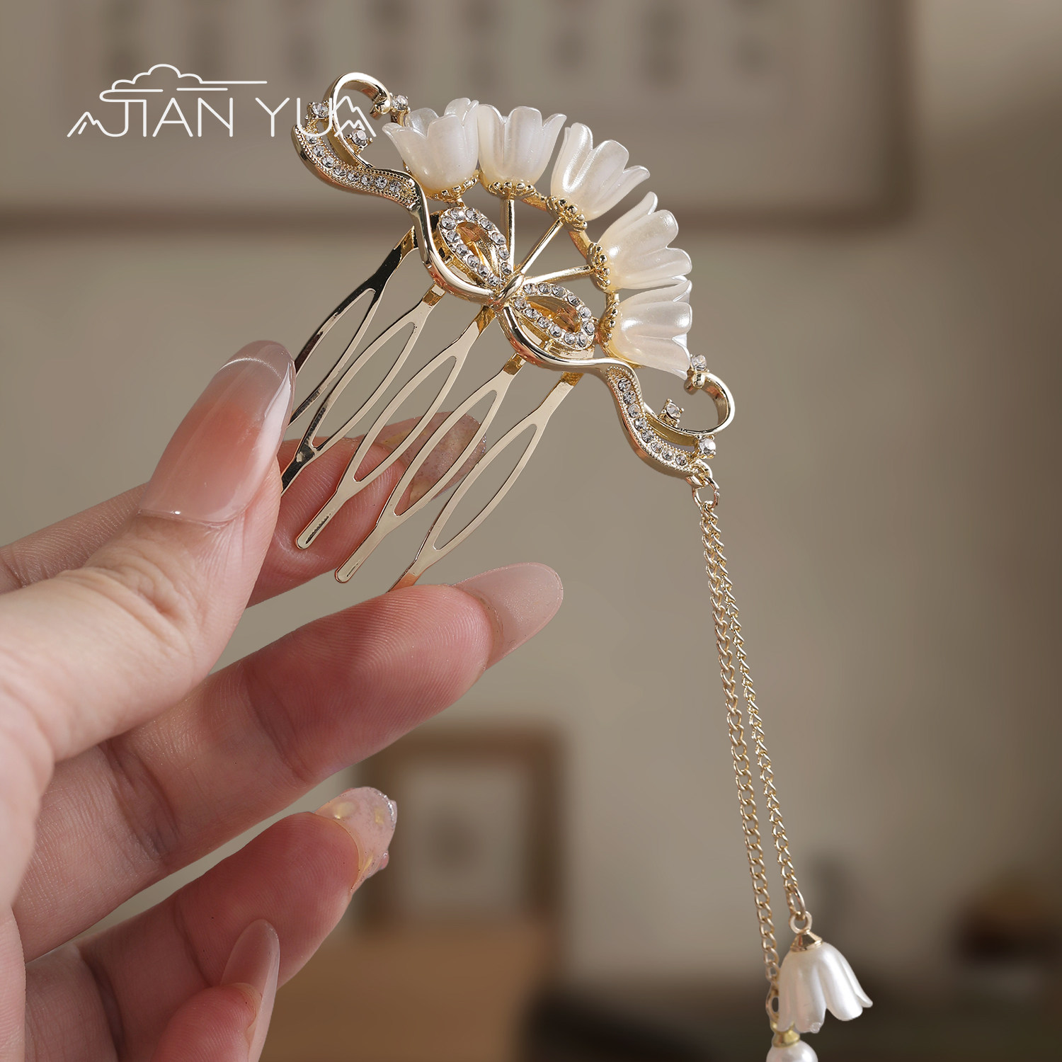 📚 金镶兰花-古风铃兰花流苏发梳汉服镶钻花朵发梳中式旗袍盘发插梳