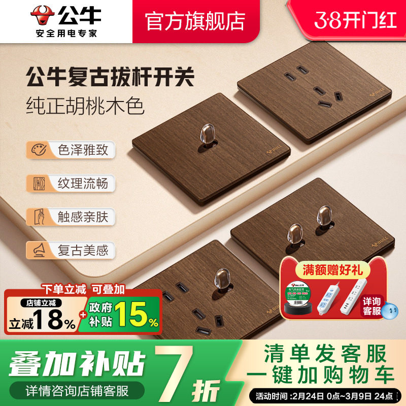 📚 公牛G70超薄拨杆开关胡桃木色五孔插座面板86型复古中古仿木纹