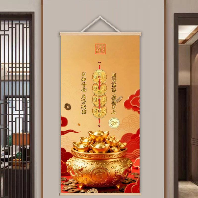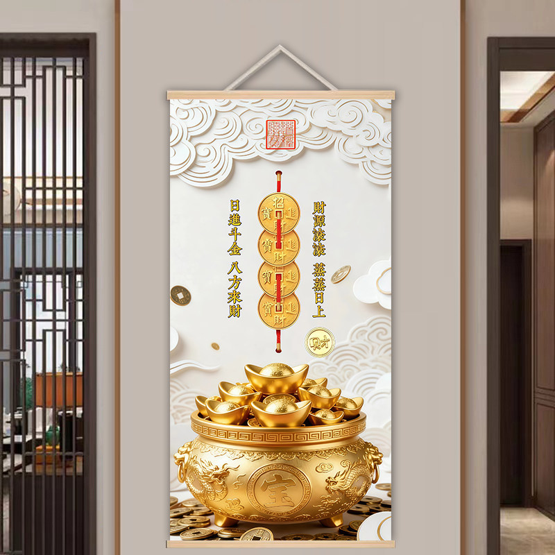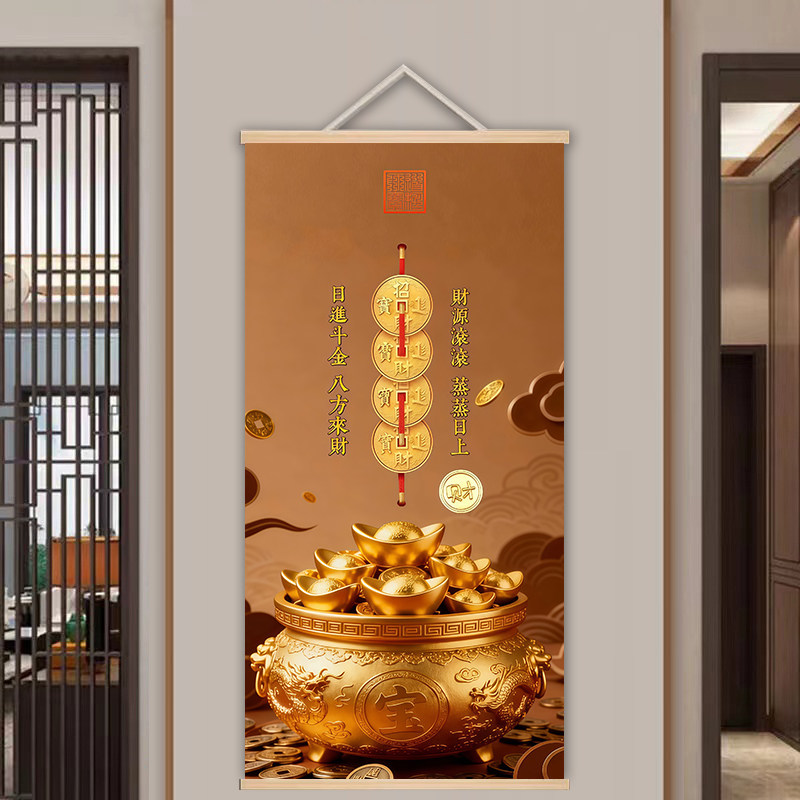 📚 聚宝盆挂画 家居商铺吸财字画 入户玄关过道实木卷轴挂画