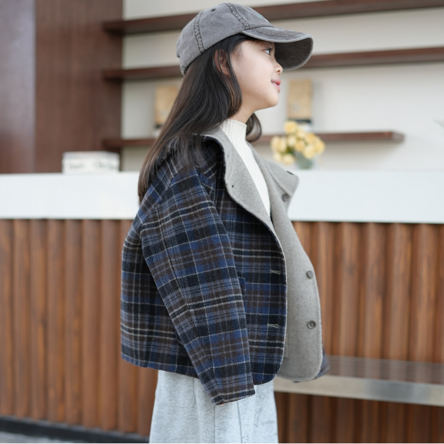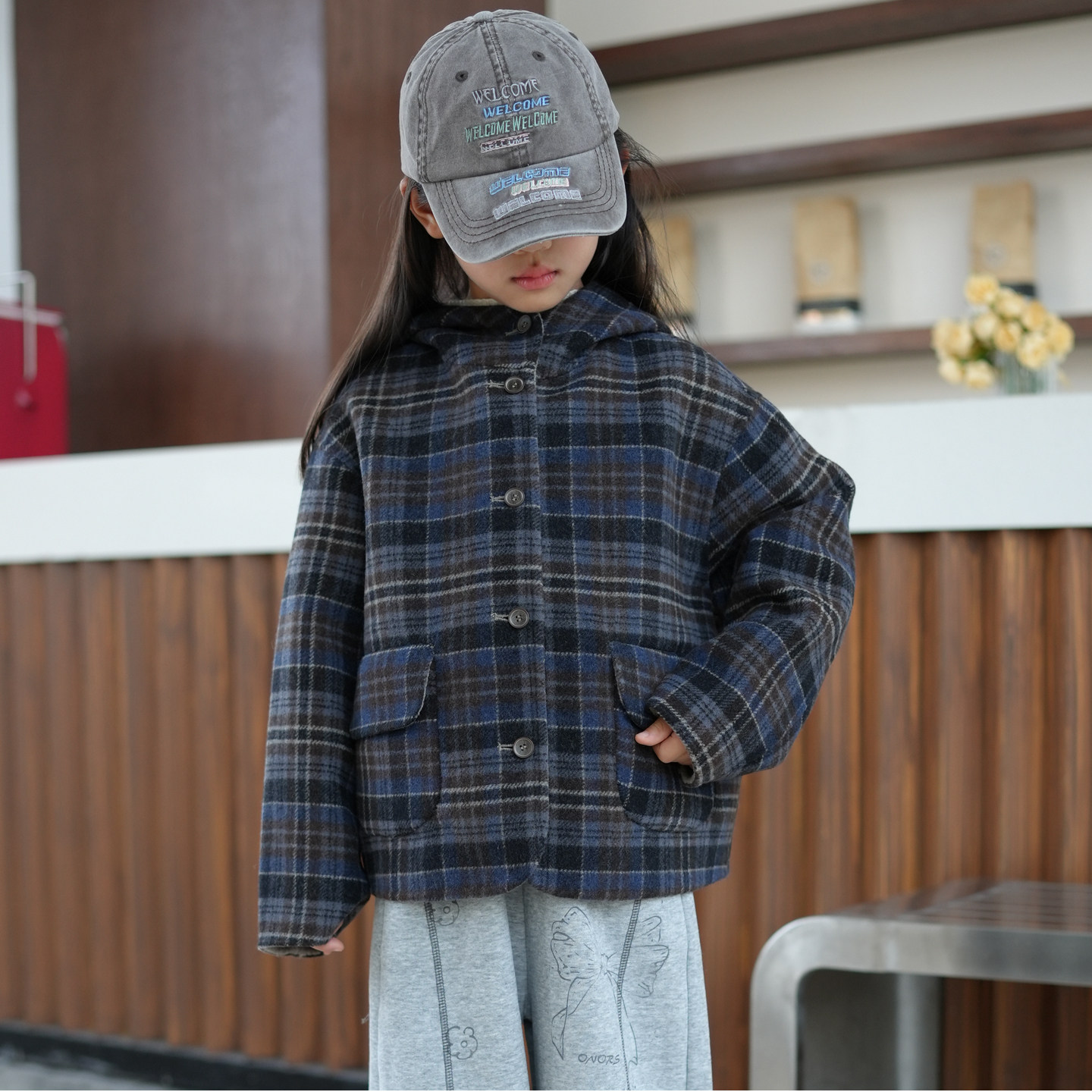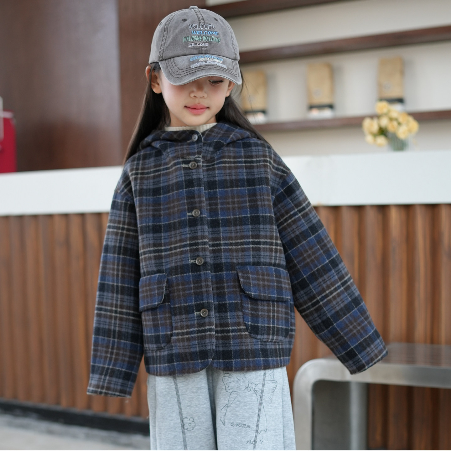 📚 童装儿童连帽上衣韩版复古格子羊毛大衣男童女童双面呢外套秋冬装