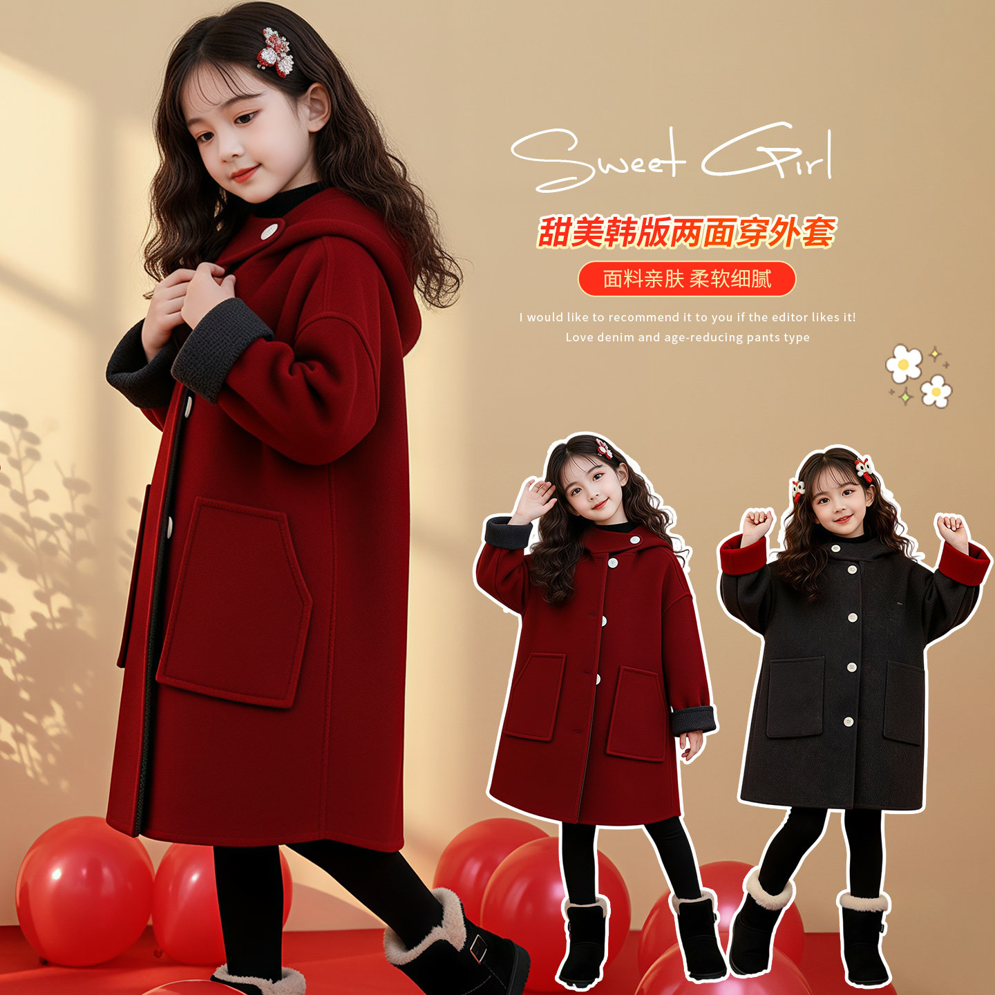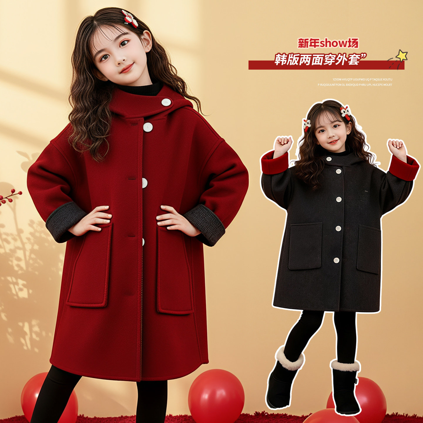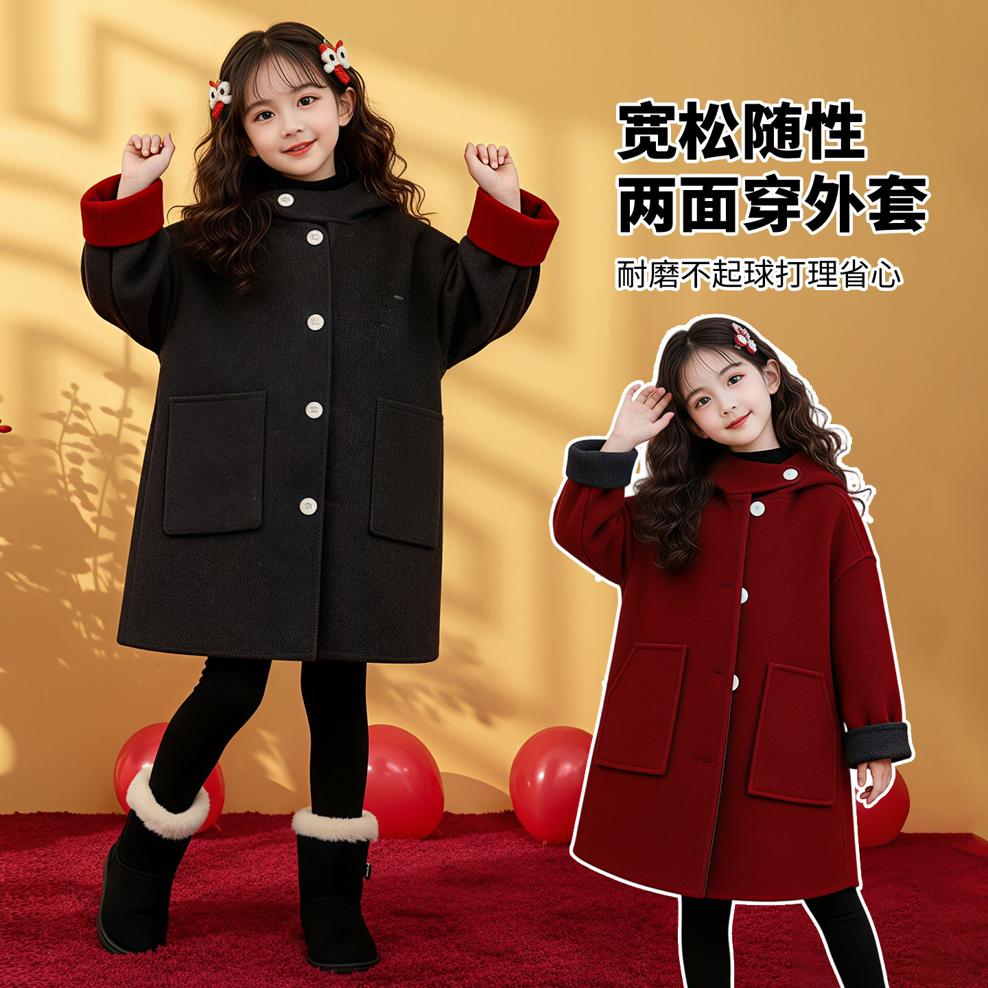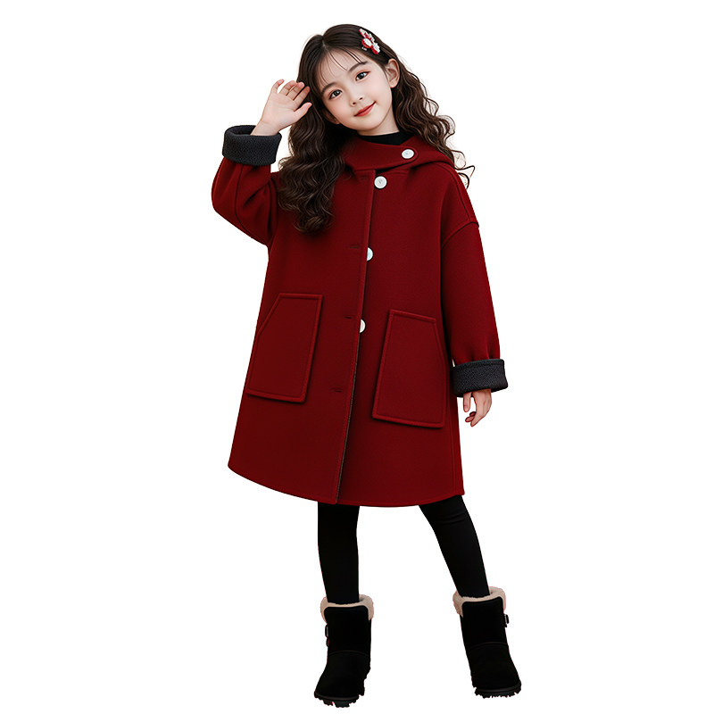 📚 儿童双面呢子大衣女孩牛角扣连帽中长款秋冬拜年服男女童毛呢外套