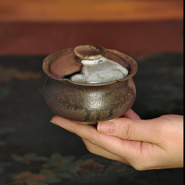 📚 林峰老师 窑汗花口钱袋子盖碗 琥珀泥(微晃盖)特365号柴烧盖碗