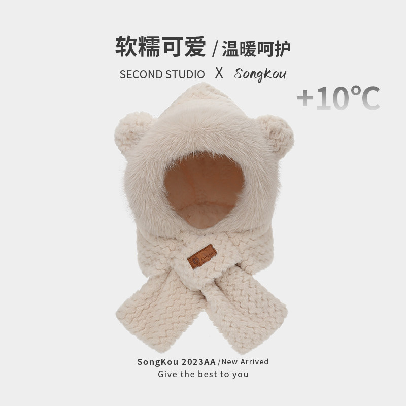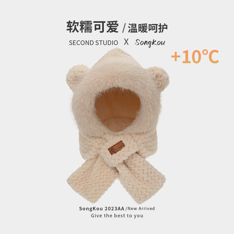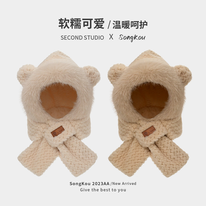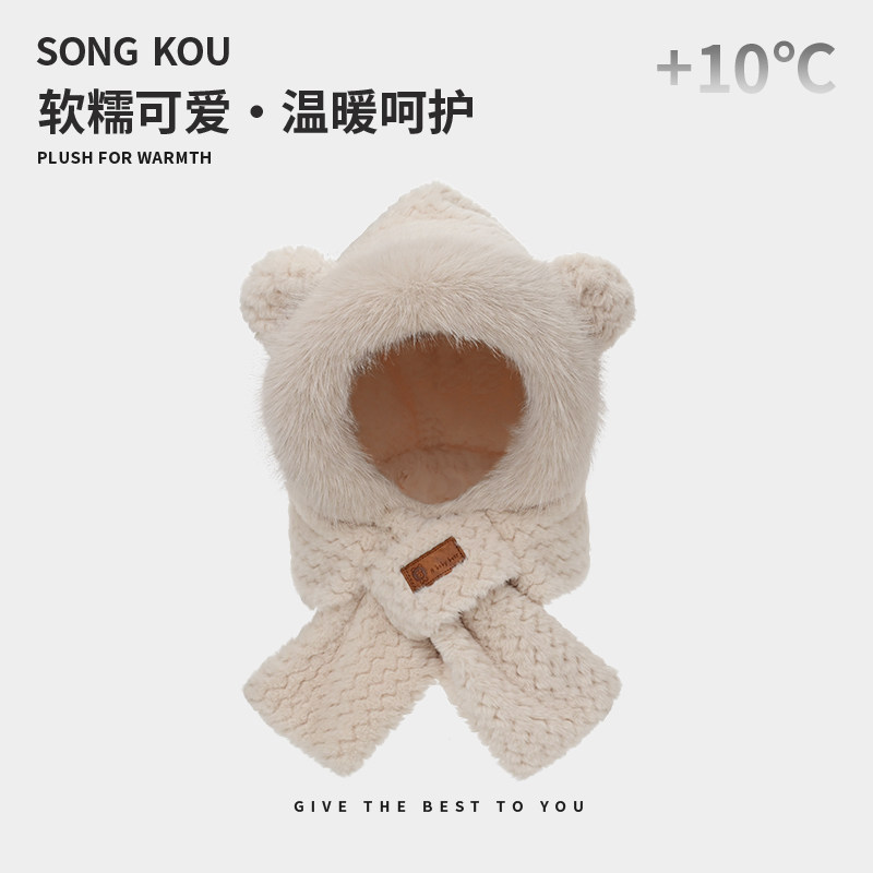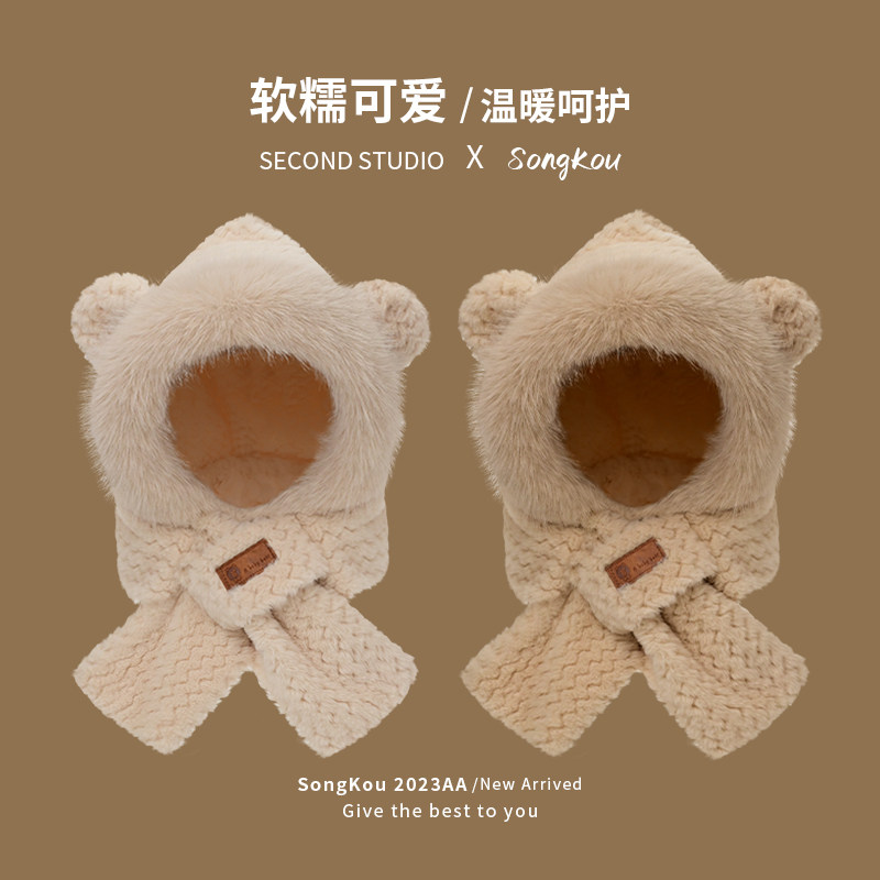 📚 毛绒小熊帽子围巾一体帽儿童保暖女秋冬季成人护耳电动车挡风围脖