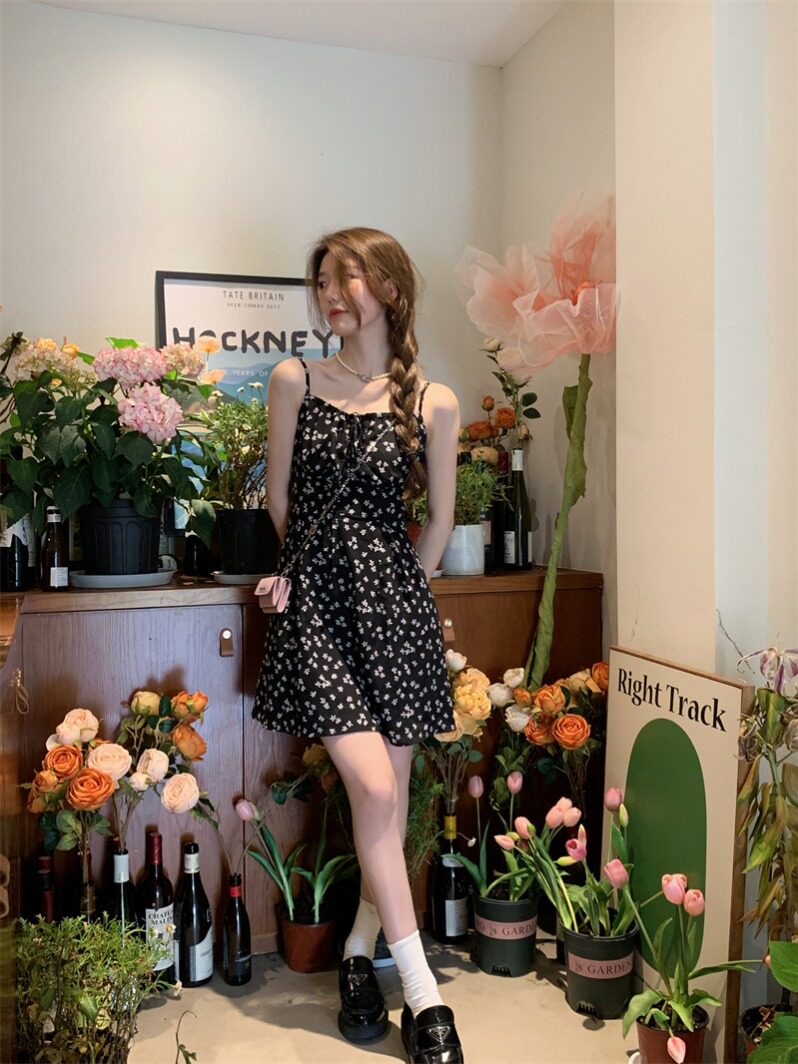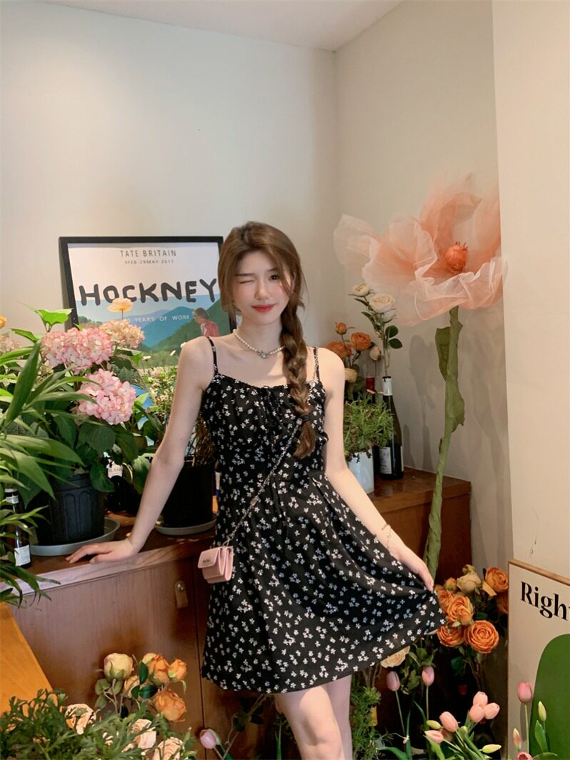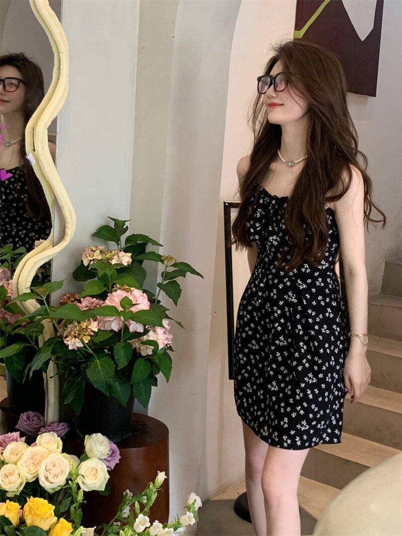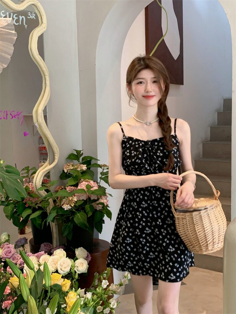 📚 吊带碎花连衣裙女春季2024新款纯欲风收腰显瘦设计感A字雪纺短裙
