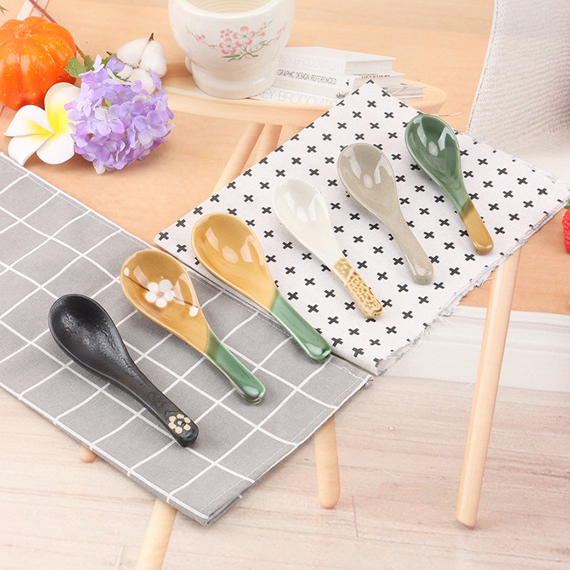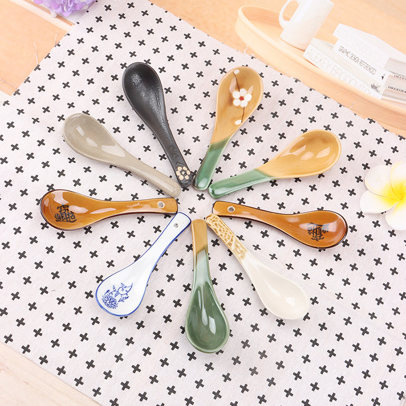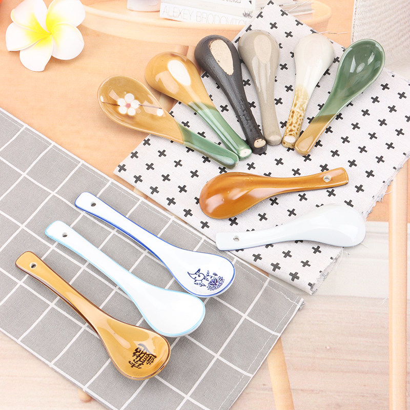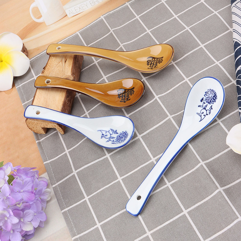 📚 陶瓷餐具小勺子复古饭勺子家用汤勺调羹饭店餐具带花长勺米饭勺