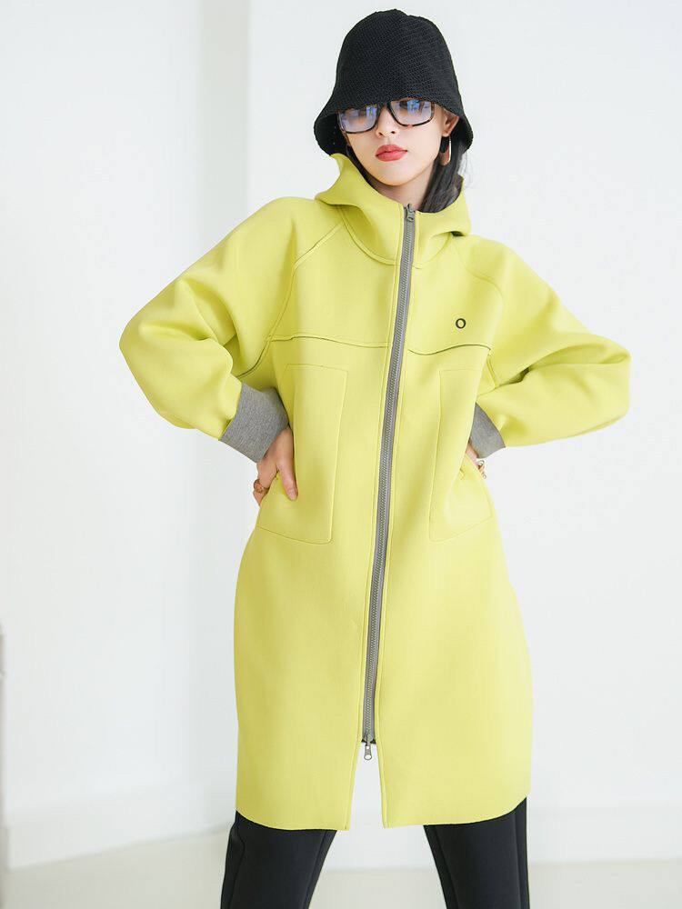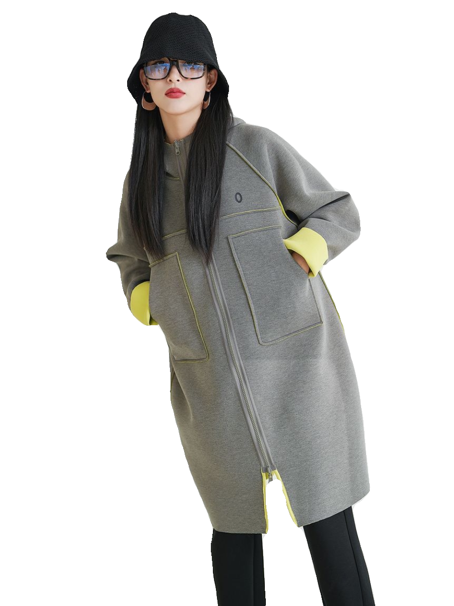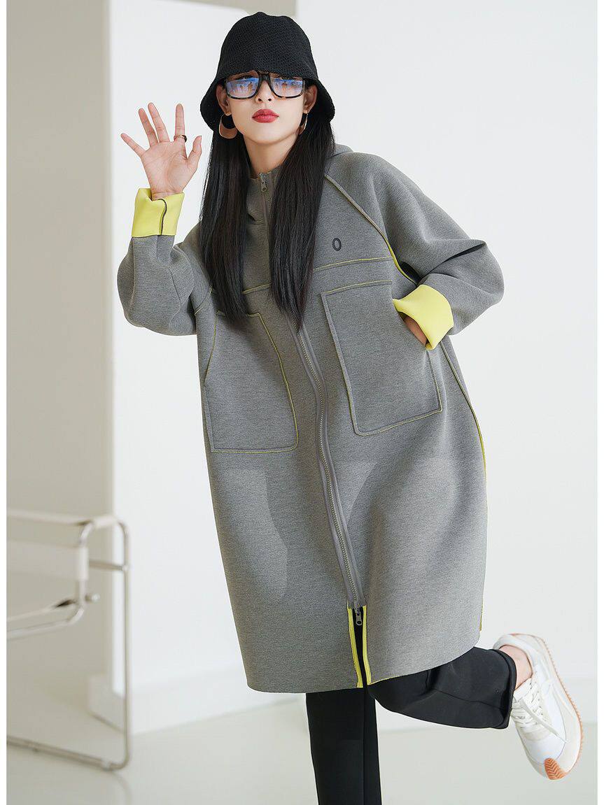 📚 北欧风格通勤连帽撞色设计感直筒太空棉开衫中长风衣女外套秋季